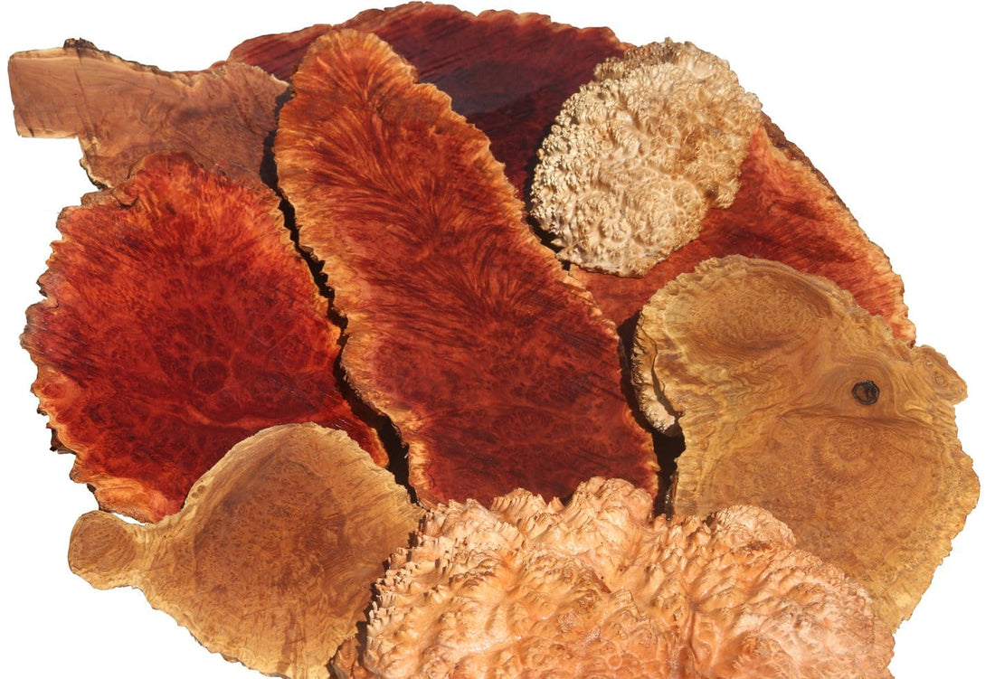Goldfield burls are a rare and wonderful species from Australia that can be expected to yield exceptional projects! These caps have been air dried for 2 years and may contain residual moisture, but are considered dry. They are surfaced on the face to reveal their natural burl eyes & rich color. Backs are natural and bark free with unique live burl edge that can be utilized creatively. Surface checks and incursions may be present throughout this batch. Please see photos for details, and feel free to call if you have any questions. Note that burl slices may require planing or sanding to lay flat.