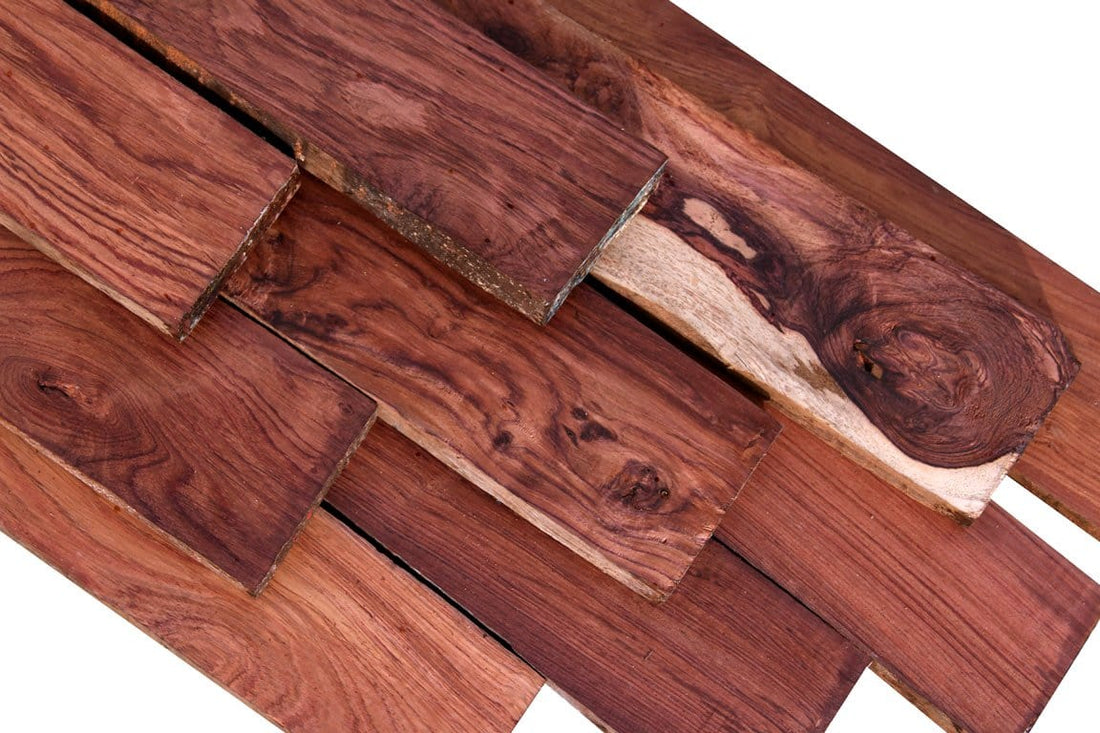 Guatemalan Cocobolo grows on a thin band along the Pacific Coast in Central America. Our stock is selectively cut and logged by hand, squared by chainsaw, and drug out of the forest by mules. This is a very environmentally low impact procedure.Cocobolo is a true Rosewood, similar in color & tap tone to Brazilian Rosewood and considered to be a good substitute. Dalbergia retusa hemsl shares some of the same properties visually and acoustically as Mexican Cocobolo and Honduras Rosewood but is a unique species. It is denser than most Rosewoods and is less oily than Mexican Cocobolo but slightly oilier than Honduras Rosewood. For best results in gluing, epoxy is recommended. Cocobolo has great working properties & turns to a naturally high polish. The colors range from any combination of dark and light purple/violet to black lines with occasional creamy white sapwood.Our stock is 95-100% heartwood. There may be an occasional pin or bug hole in 3% of this stock. Some may have a small 1-3 check on one face or edge. There are tapers in the widths of these boards so the widest point is at one end of the board and then they gradually taper to the other end of the board (see width of each item for details). On the long boards it is hard to visually see as it is subtle. 1/8 crown or 1/16 bow may be present but generally the boards are flat & straight. This is excellent material for ukuleles, marimbas, boxes, pens, inlay and marquetry. Items marked XF have swirling, unique grain patterns.