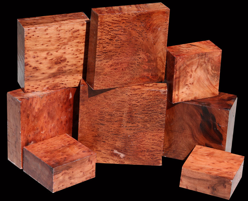 Redwoods are the tallest living trees that have ever been on planet earth! Coastal Redwoods (Sequoia sempervirens) are the tallest trees, but their cousins, the giant Sequoia (Sequoia gigantium) take the record for the largest living tree in the World. In the mid 1800's logging operations commenced in the forests where these beautiful trees grow, leaving behind a path of stumps and logs that were deemed unusable. Today, stumps and logs less than 16 ft. long are being extracted from these areas. Most of this salvaged wood still produces solid wood that has been aged and slowly dried over a hundred or more years. Our Redwood is all salvaged. Redwood is suitable for large tables, bar tops, mantles, cabinets, Guitar tops, and turnings. Figured boards are sometimes available with flame, fiddleback, or burl eyes which can produce beautiful bass or electric guitars or other high end projects.