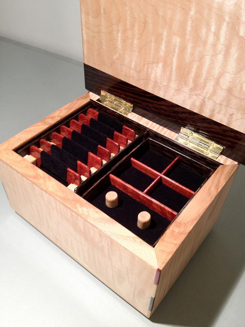 This jewel box is multilayered with separate compartmentalized trays. Woods used in construction are: quilted Maple, Cocobolo, Wenge and Holly.