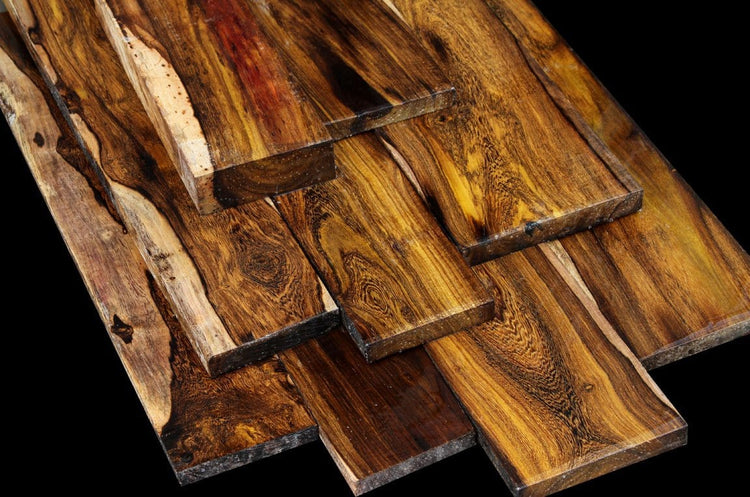 Pheasantwood, also known as Thailand cassia or Senna siamea, is a rare species of hardwood (scientific name: Cassia siamea), named after the black and golden figured patterns of a pheasant's tail feathers. The flat or slab sawn face shows the most finely defined patterns with contrasting golden and black streaks. Pheasant wood is a very close color and grain match to Desert Ironwood. It is excellent for fine articles such as boxes, pens, and more. It polishes easily and will reflect light with only a light sanding from 150 grit sand paper. Intense color reflections can be achieved with 320 grit and finer. Usually grown as an ornamental tree for showy flowers, this species is more difficult to obtain than Ebony and is a cherished wood from the Hawaiians to the South East Asians. This is an extremely rare wood is from the same forests that our Black & White and Mun Ebony are from in Laos. Once used in your project, you will be thrilled with the iridescence and fine grain that this wood produces.