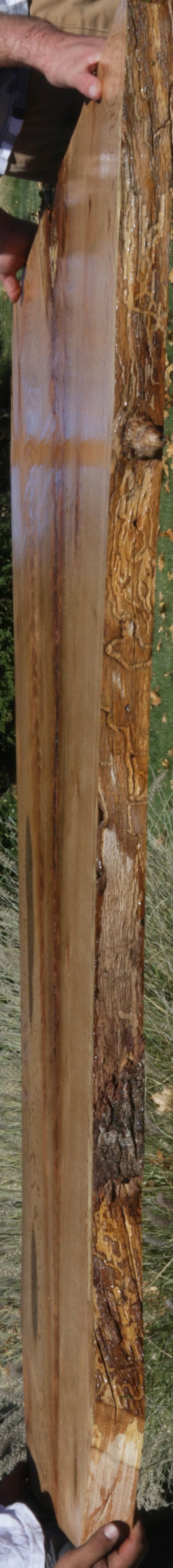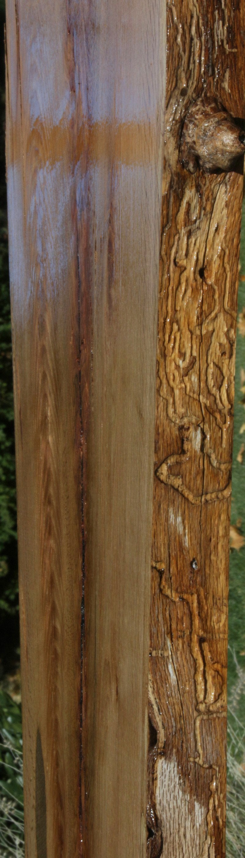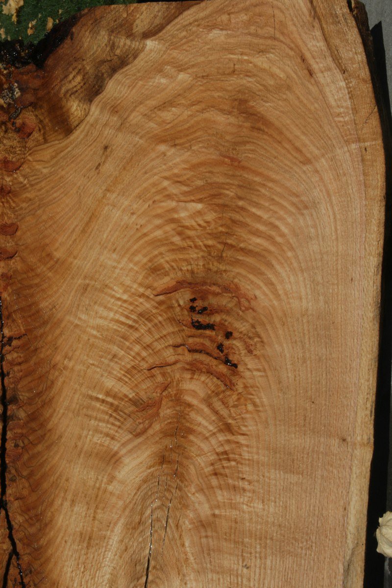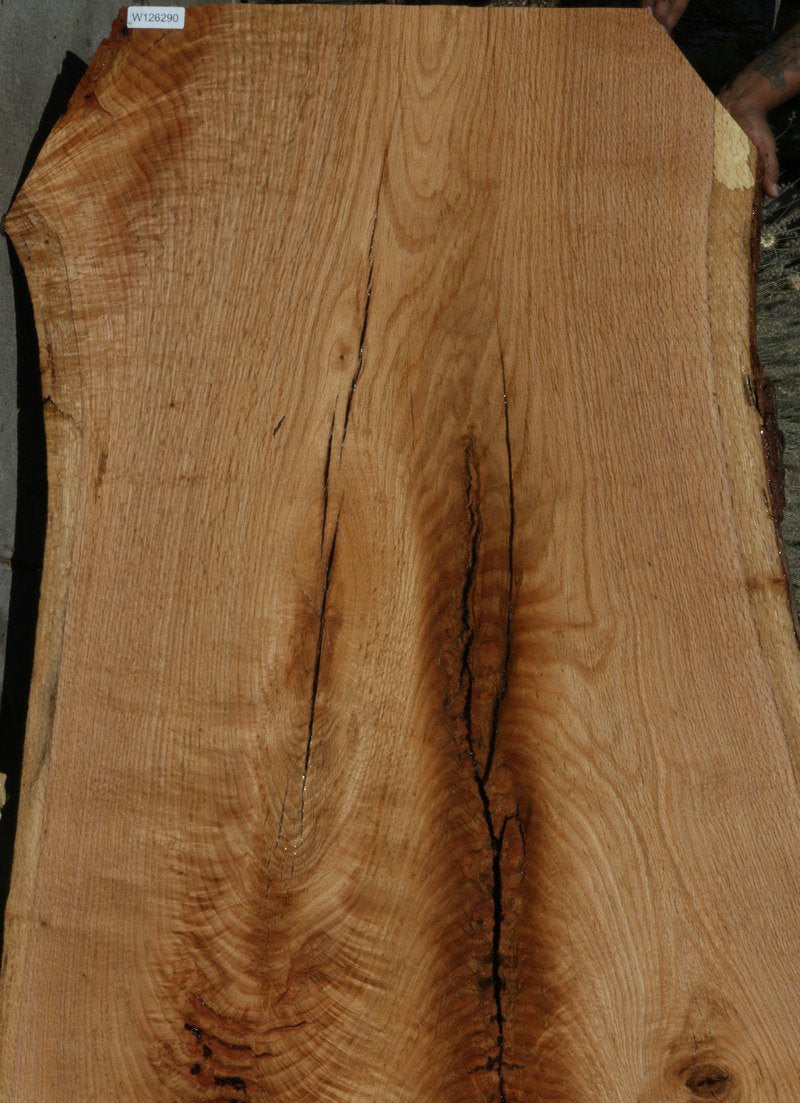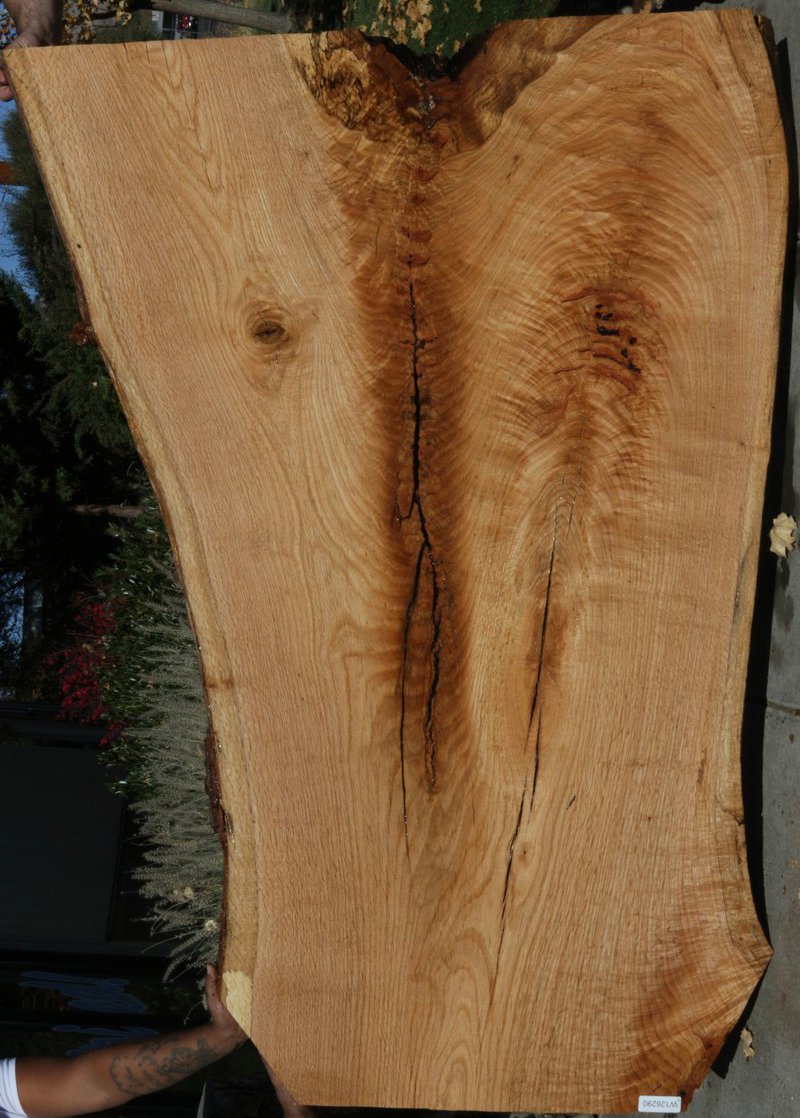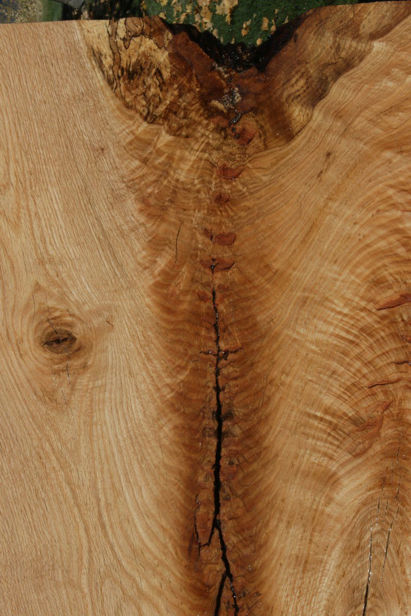 This high quality Oak lumber has lovely, intricate patterns, flecking or curly figure! It is kiln dried and surfaced on two sides. This offers a great quality for your dollar! This slab has large checks and splits present. There are multiple honeycomb checks. Some areas have soft spalting present. There are knots with some checks present. Must be able to work with.