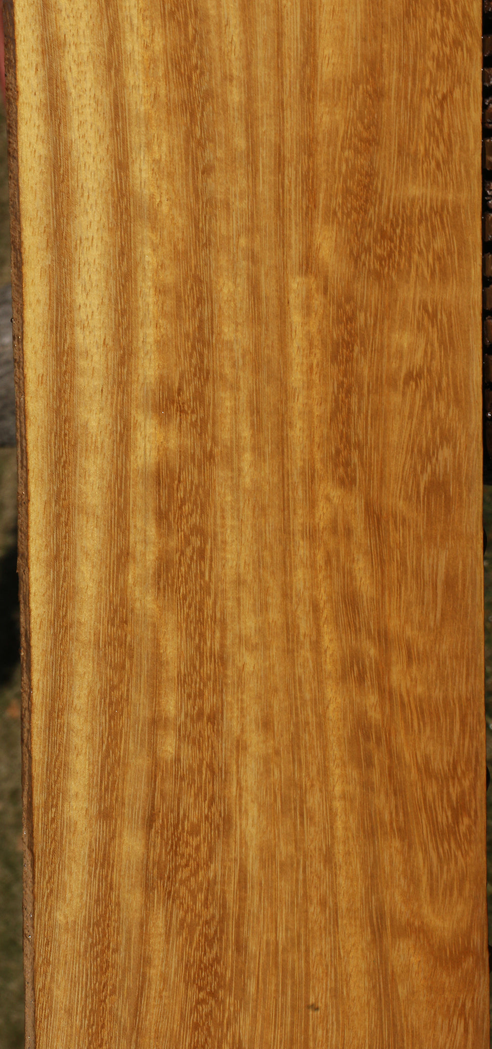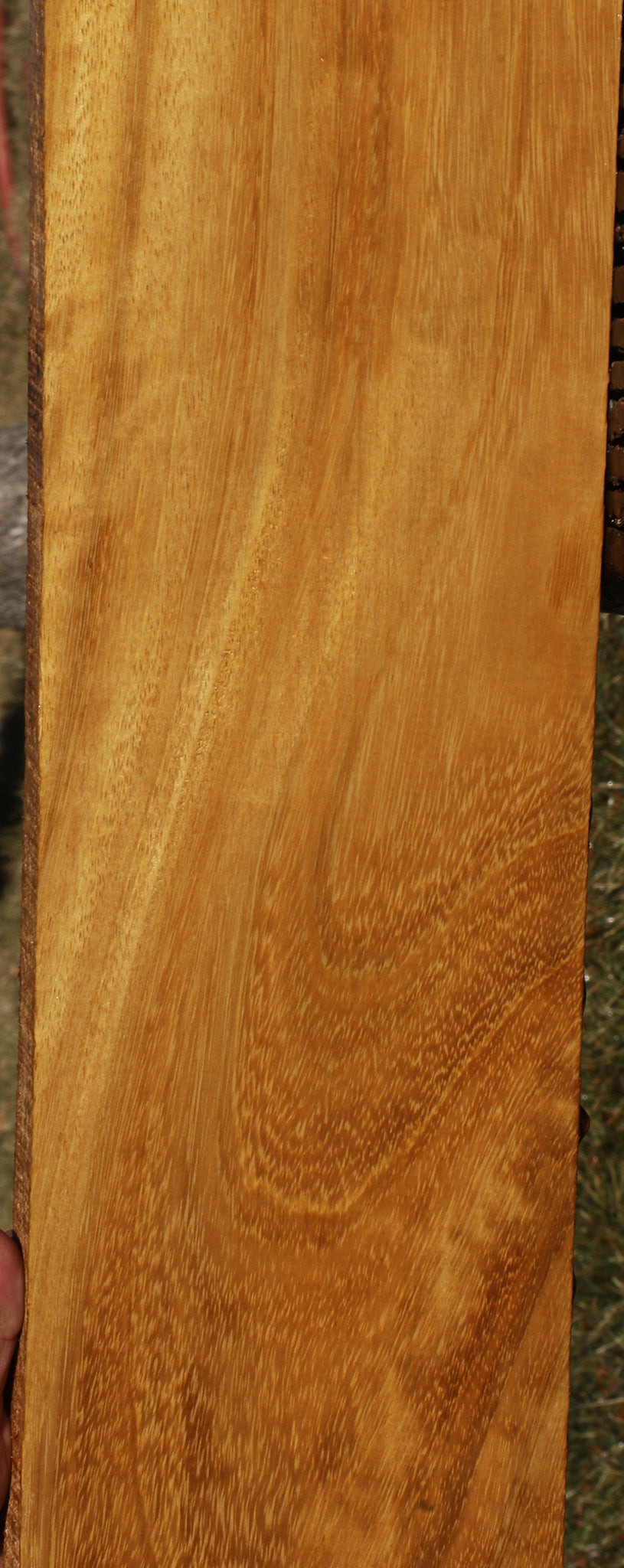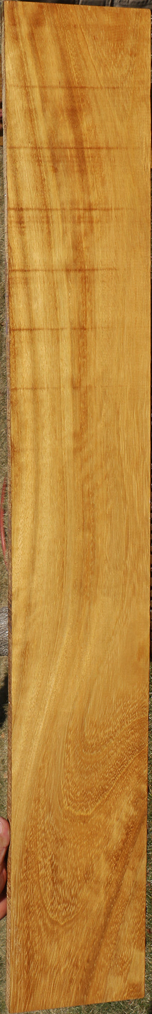 This African Teak lumber is kiln dried and has been surfaced on two sides. The heartwood ranges from yellow to golden with a slight hint of brown. It has a coarse texture with open grain. Quarter or rift sawn boards may show some ribbon or fiddleback figure, as shown in the picture of each item. A minor end or surface check may be present. Boards over 36" may have a slight 1/16" to 1/8" bow/twist. This is an exceptional substitute for genuine Burma Teak at a fraction of the cost! This piece has an end split. Please see pictures for details.