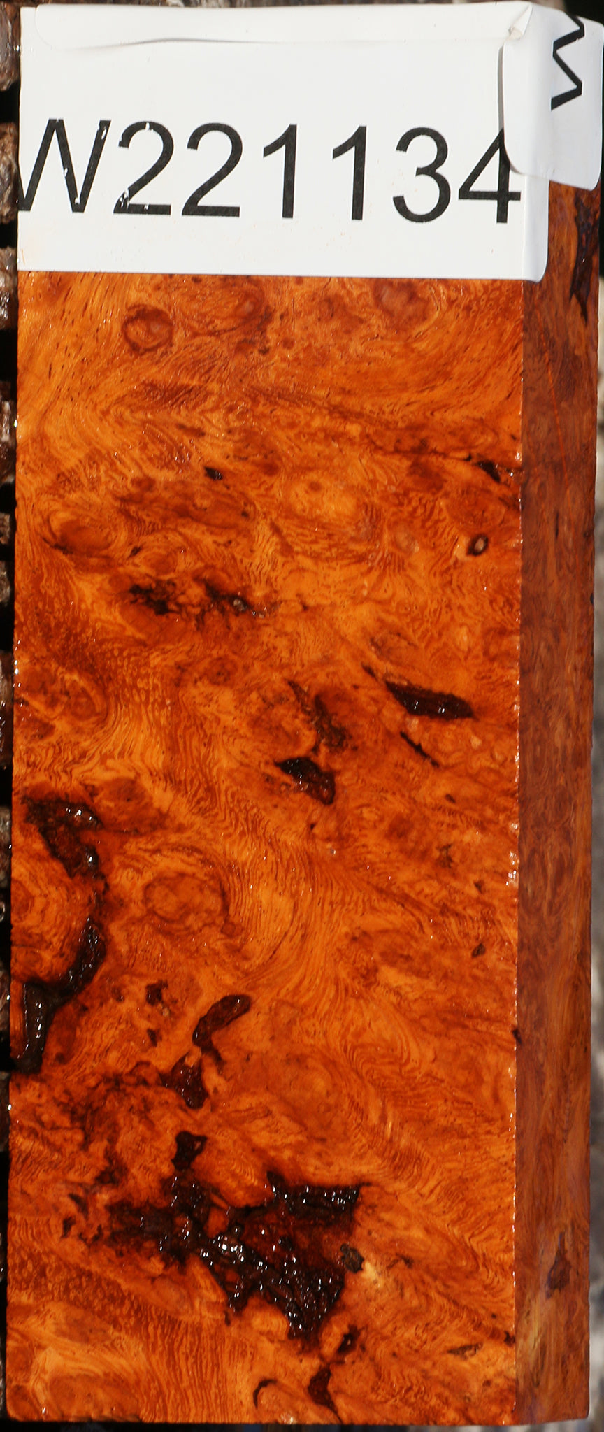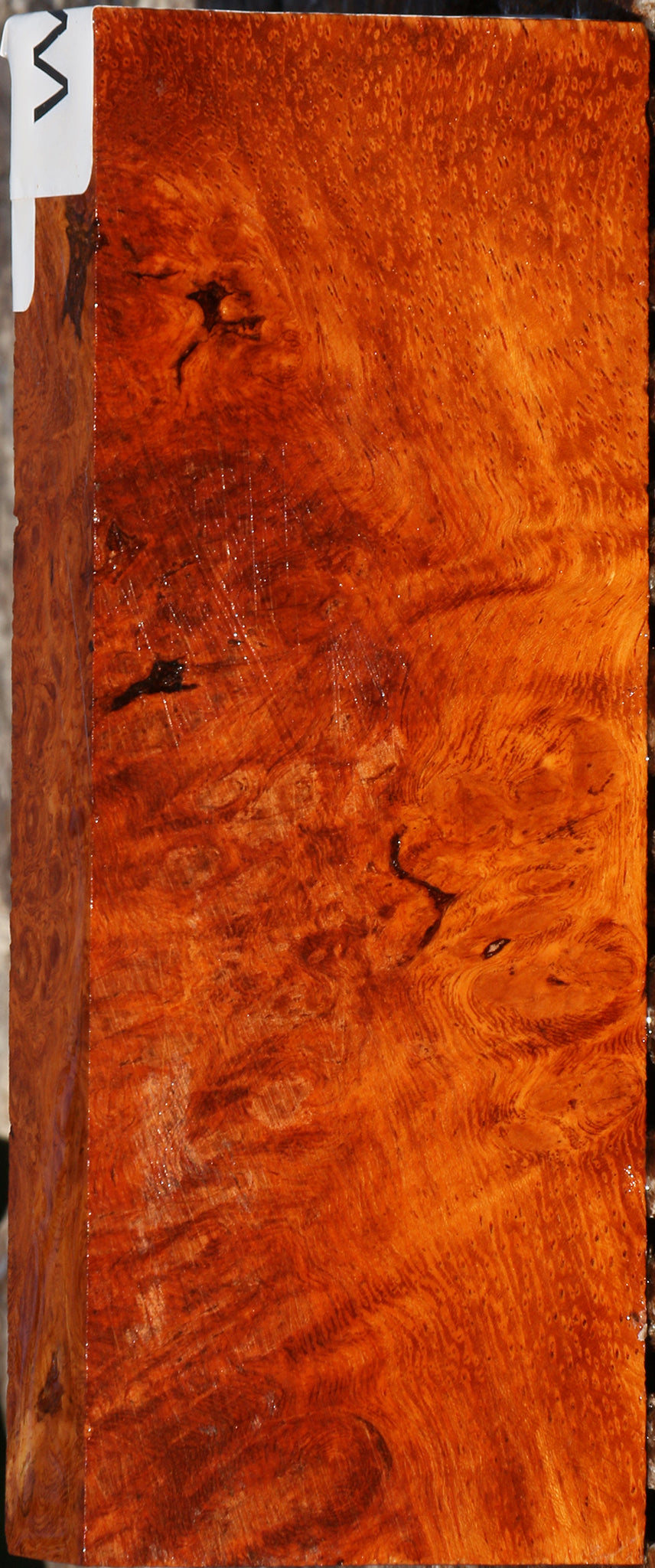 This exceptional stock combines figure and burl with warm Amboyna-like colors! There are inclusions present on all pieces. Some may have rough edges and small voids. Crushed turquoise or other minerals can be used as a stunning inlay contrast in areas that contain inclusions. This stock has been air dried for 7 years and is ready to use. This piece has inclusions. Please see pictures for details.