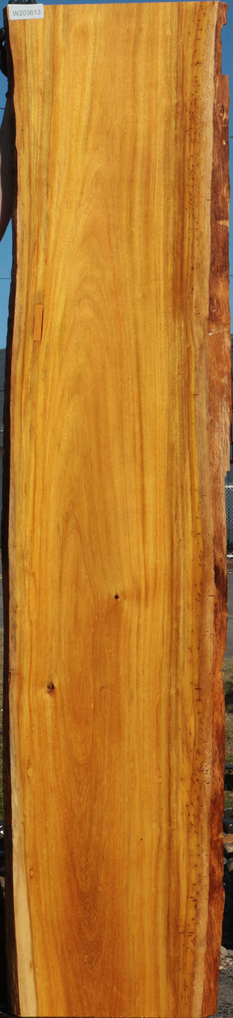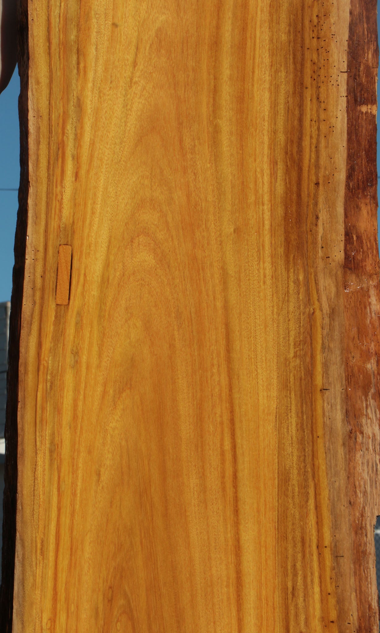 This Argentine Osage Orange lumber has incredible golden/orange to bright yellow color! As it ages and picks up UV light, it turns into a medium brown/orange color. It is kiln dried and surfaced on two sides. A 1/16" to 1/8" bow or twist may be present in boards over 36" long. An occasional knot may be present. Live edges will have some checks as these occur naturally with sapwood. This piece has bug holes, checks, knots, and a plug on the numbered face. Please see pictures for details. (This piece requires shipping by UPS oversize or freight due to its size. This item does not qualify for free shipping.)