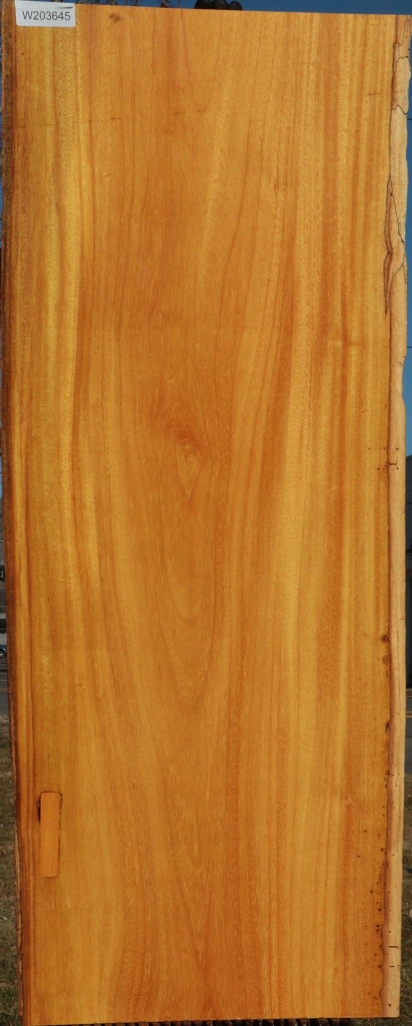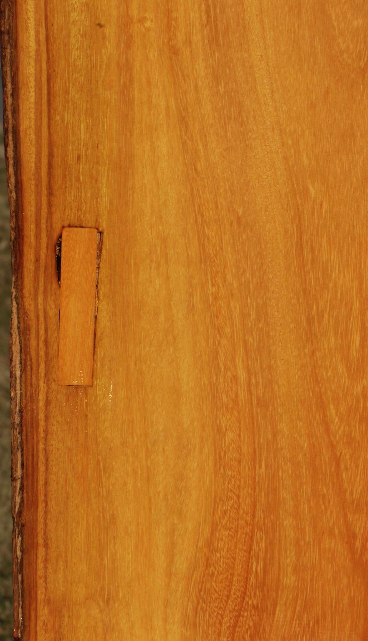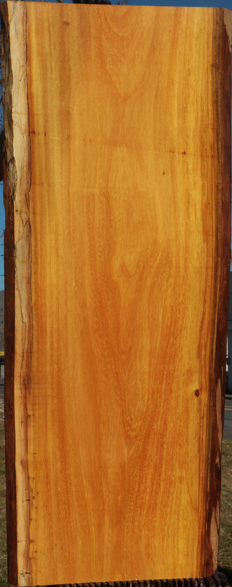 This Argentine Osage Orange lumber has incredible golden/orange to bright yellow color! As it ages and picks up UV light, it turns into a medium brown/orange color. It is kiln dried and surfaced on two sides. A 1/16" to 1/8" bow or twist may be present in boards over 36" long. An occasional knot may be present. Live edges will have some checks as these occur naturally with sapwood. This piece has bug holes, knots, and a plug on the numbered face. Please see pictures for details.