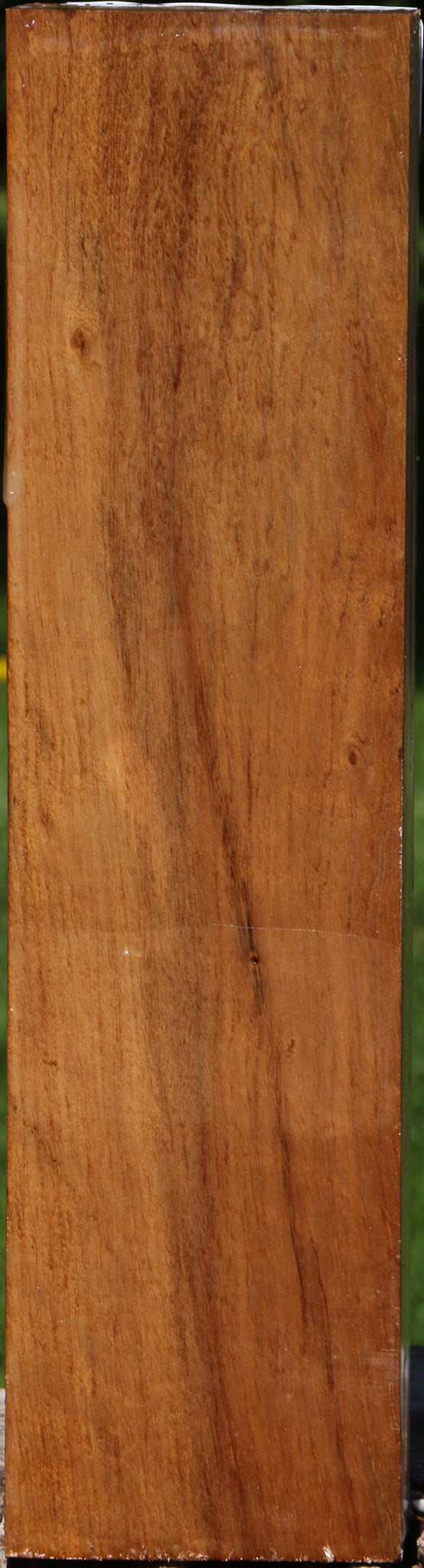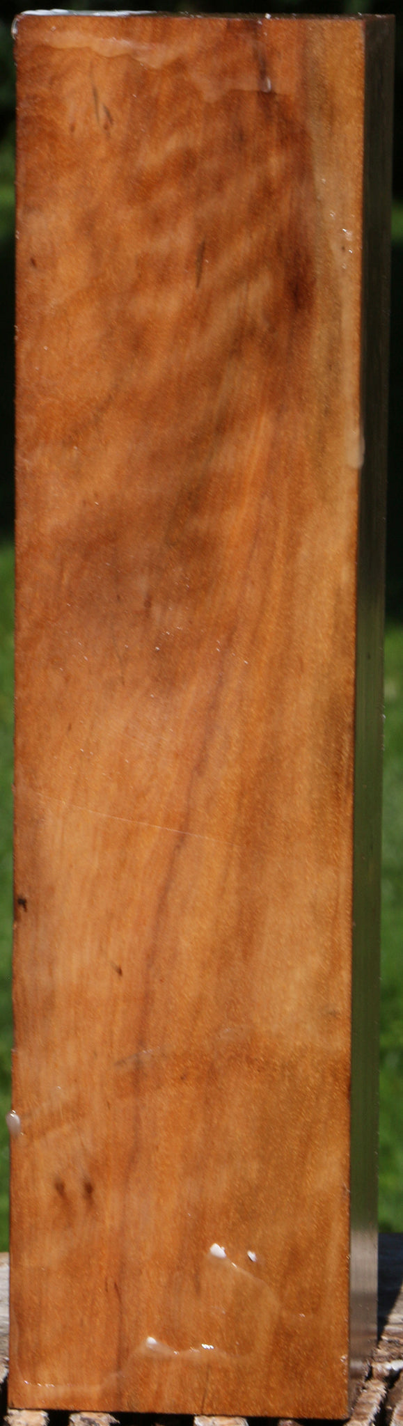 Asian Satinwood can contain the most amazing 3-D curl we’ve ever seen! This material has been air dried for 4 years. It is generally dry, but may contain some residual moisture. Boards are wax sealed on the ends only. Turning blanks are either completely wax sealed or sealed on the ends only. Some spalting or minor checking may be present, but this can be remedied with CA glue. 95% of these pieces are clean and free of defects. Please leave wax on the wood until use to avoid checking. Beautiful luster and sheen as well as fine grain with wonderful workability make this an exceptional choice for woodworking projects. This piece has bug holes. Please see pictures for details.