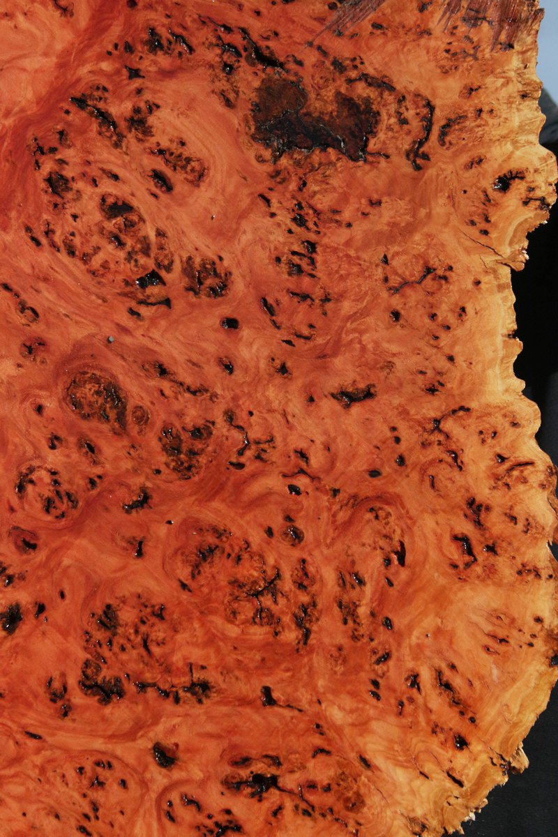 This unique Australian wood is very dense with spectacular grain! A very high polish is attainable and voids or checks are easily filled with epoxy resin. Sharp tools are recommended. Most pieces are dry and ready to use, although there may be slight residual moisture in some. This gorgeous wood will make projects that are unforgettable. This round slab has surfaced checks, incursions, and small knots present.
