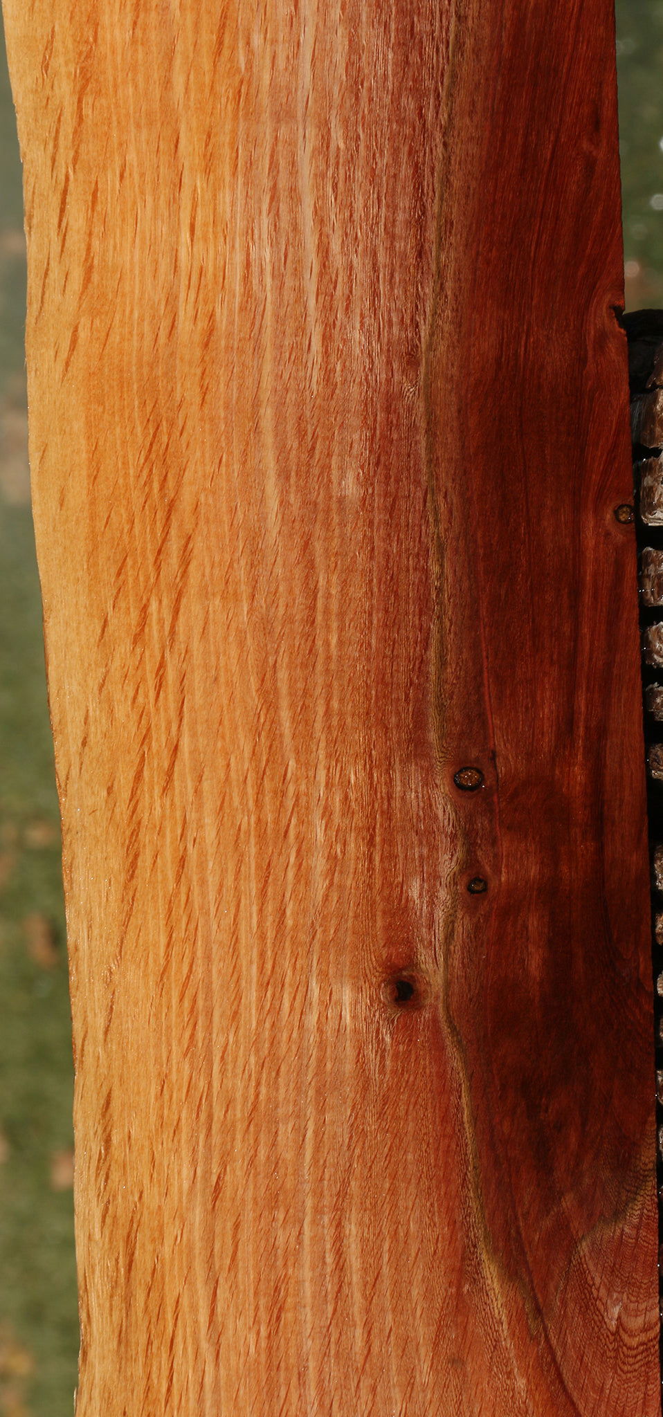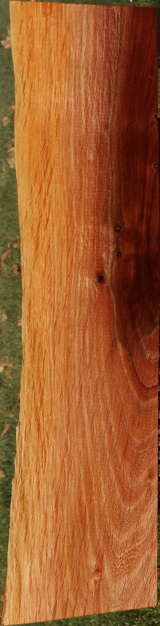 This very rare Australian Beefwood lumber has warm red colors contrasting with lighter colored sapwood. It is kiln dried and has been surfaced on two sides. There may be an occasional check on a live edge or small end check. There may be a 1/16" to 1/8" bow or twist in boards over 36". Try this Australian species out today, as it is rarely available on the US market! This piece has splits, knots, and inclusions. Please see pictures for details.