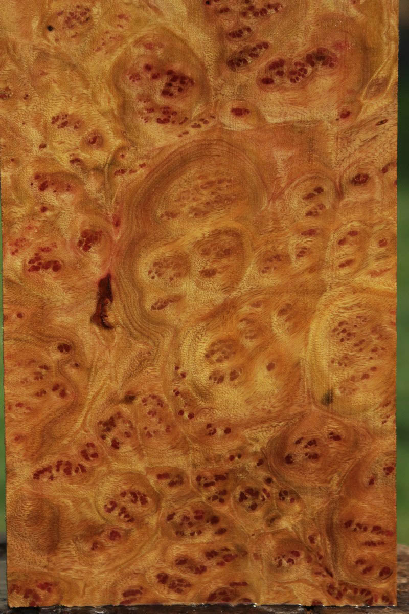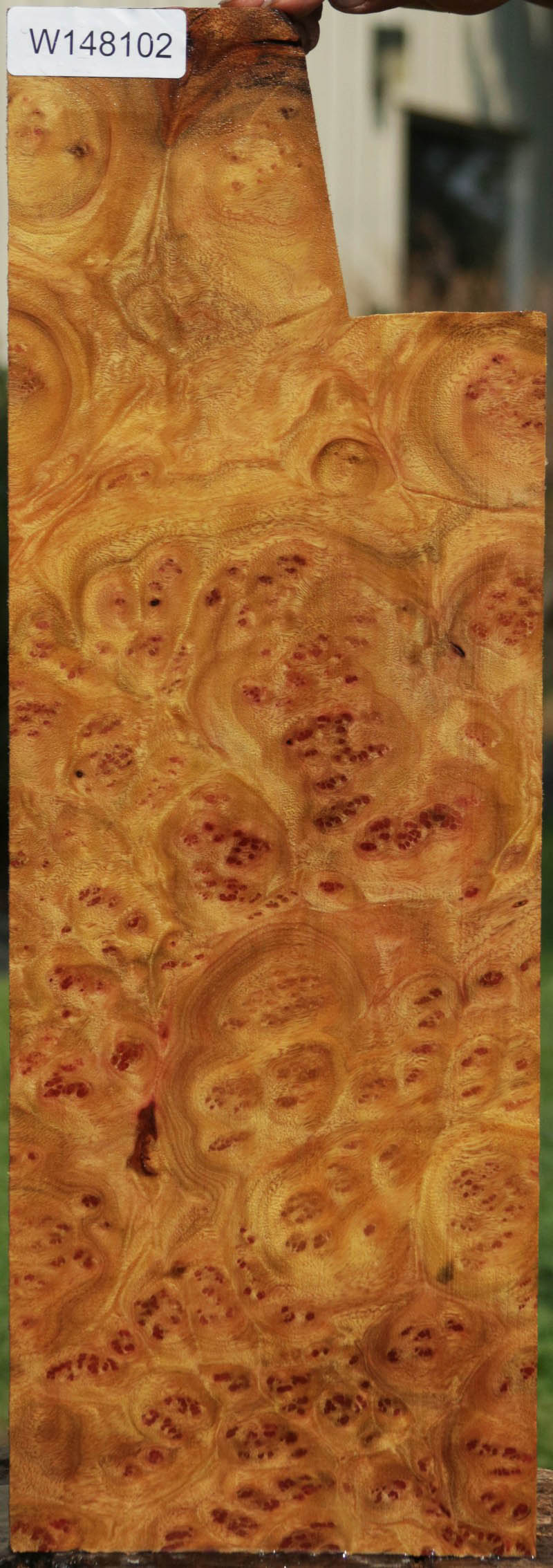 This gorgeous Camphor Burl wood was cut from several large, high quality burls. It has air dried for a decade and has been wax sealed. There is a slight amount of residual moisture as of August 2021. Since the wood is aromatic, your cut offs can be stored in an open box to freshen the air in your shop! This piece has a 3/16" bow. It will lay flat with minimal pressure.