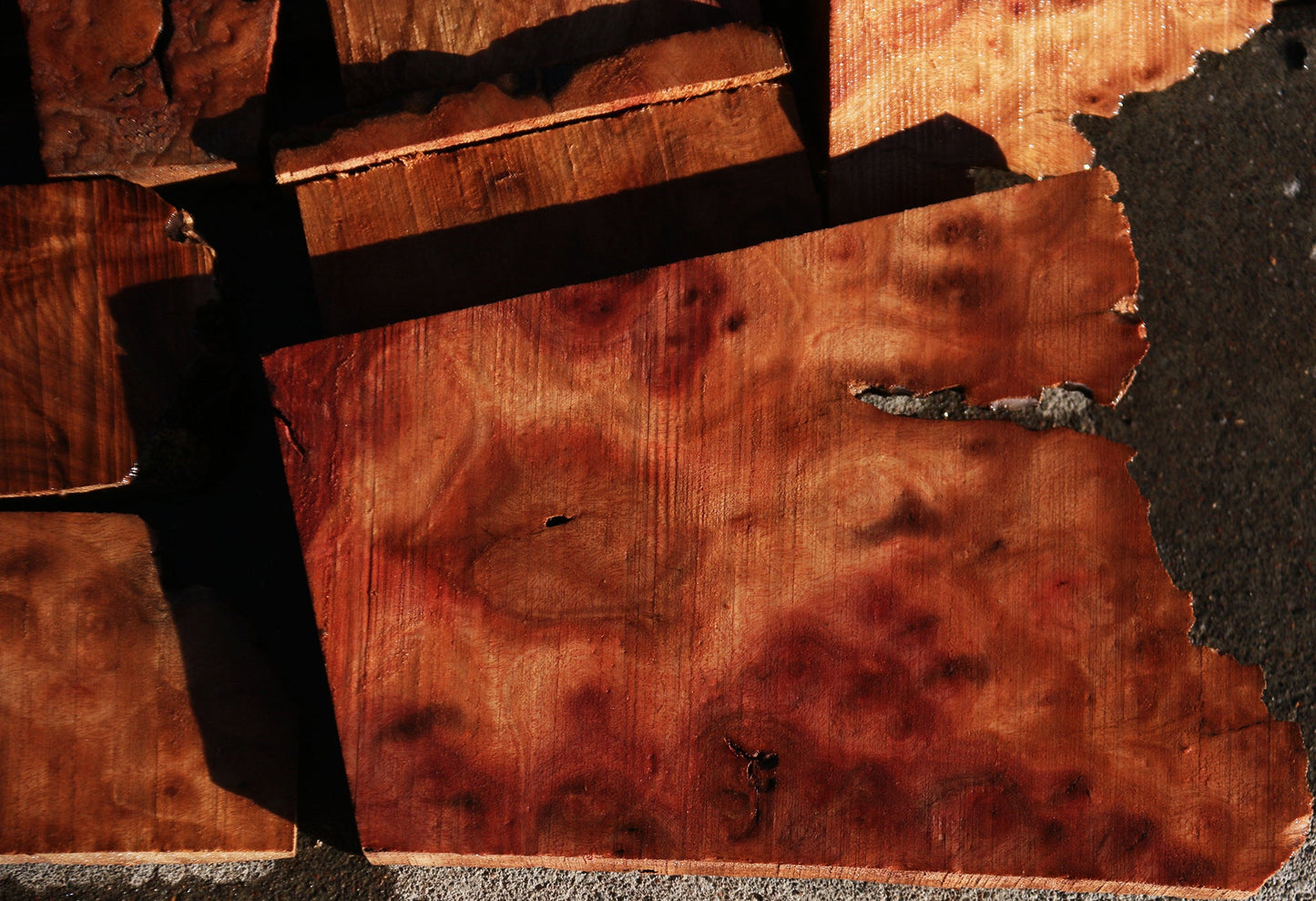 This gorgeous exotic Camphor Burl wood was cut from several large, high quality burls. It has air dried for 4 years and has been wax sealed either fully or just on the ends. There is a slight amount of residual moisture as of December 2024, but the wood is nearly dry. Checks and inclusions may be present. A slight bow or twist may be present. Since Camphor Burl is aromatic, any cut offs you generate from your woodworking projects can be stored in an open box to freshen up the air in your shop! Pieces in this box may have a live edge, checks, inclusions, splits, and/or bug holes. Please see pictures for details.