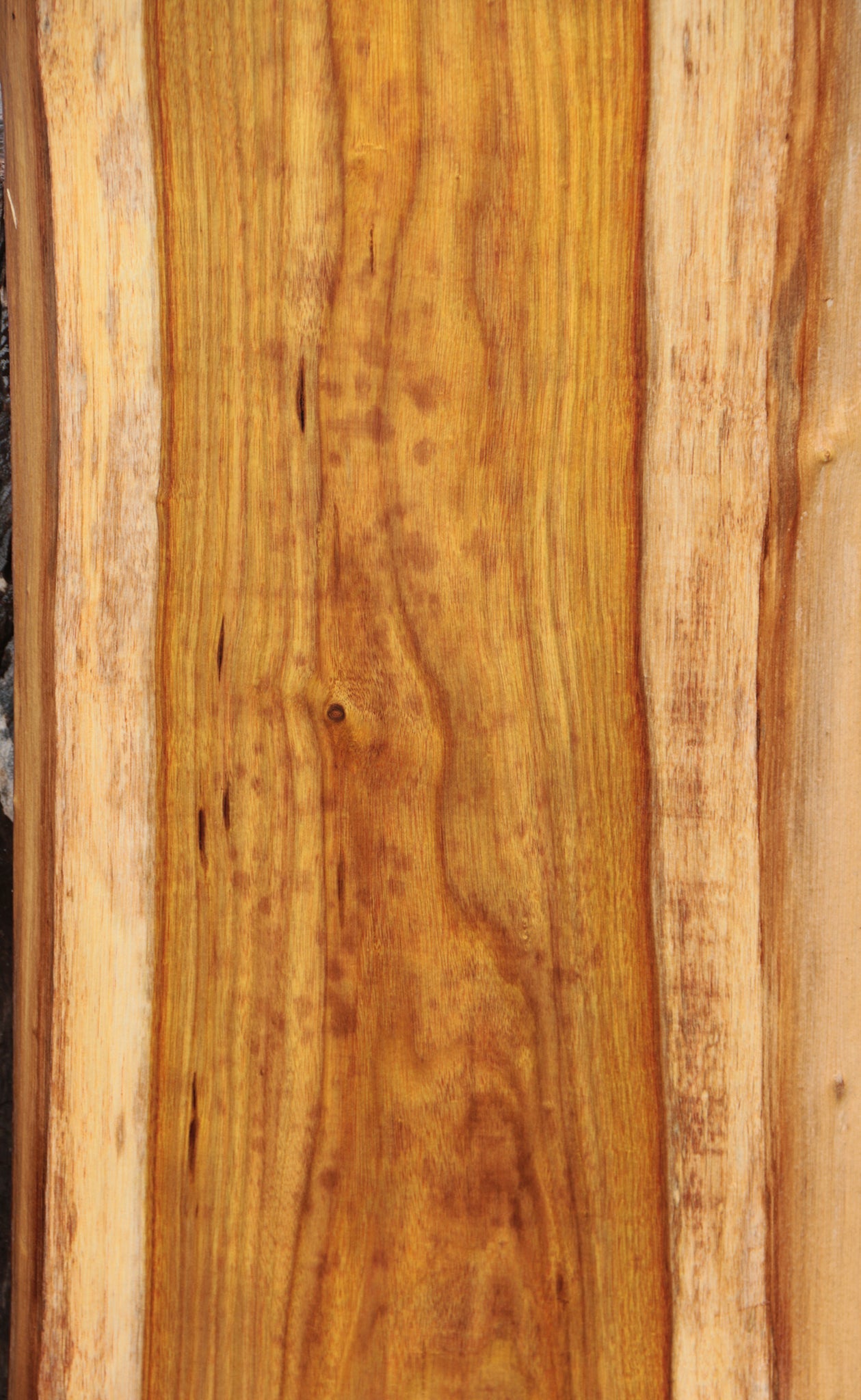 This live edge Canary wood has a wide range of color from red, orange, yellow, and green, to golden and brown. Similar in density to Brazilian Tulipwood, Canary works easily for a dense hardwood and takes a high natural polish. The wood is kiln dried and surfaced on two sides. It is very clean and usable, but may contain occasional bug holes or an occasional small check. Boards over 36" long may have a slight bow or twist that is 1/16" to 1/8". This species is used in all kinds of fine woodworking projects. This piece has checks and inclusions. Please see pictures for details.