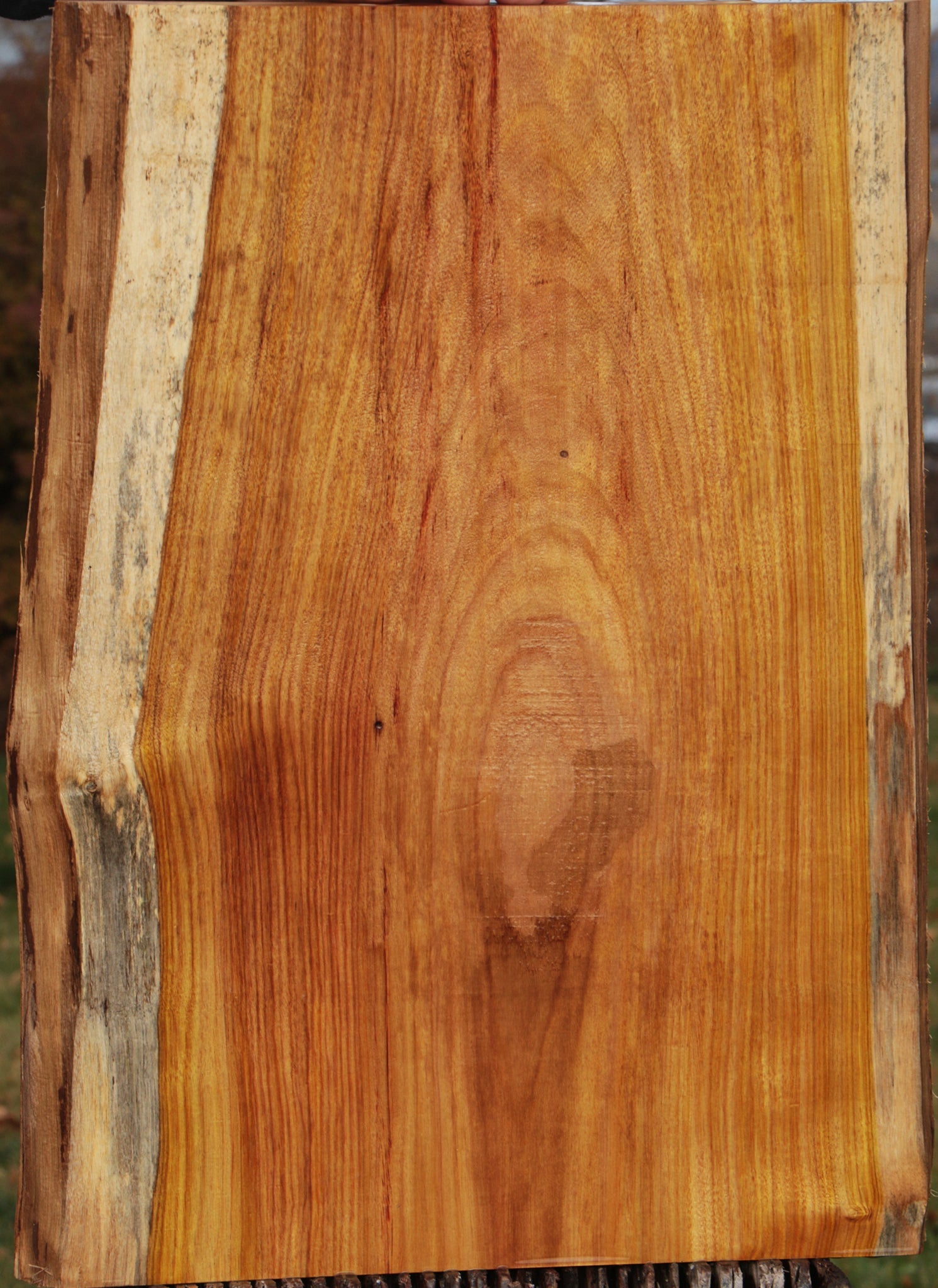 This live edge Canary wood has a wide range of color from red, orange, yellow, and green, to golden and brown. Similar in density to Brazilian Tulipwood, Canary works easily for a dense hardwood and takes a high natural polish. The wood is kiln dried and surfaced on two sides. It is very clean and usable, but may contain occasional bug holes or an occasional small check. Boards over 36" long may have a slight bow or twist that is 1/16" to 1/8". This species is used in all kinds of fine woodworking projects. This piece has inclusions. Please see pictures for details.