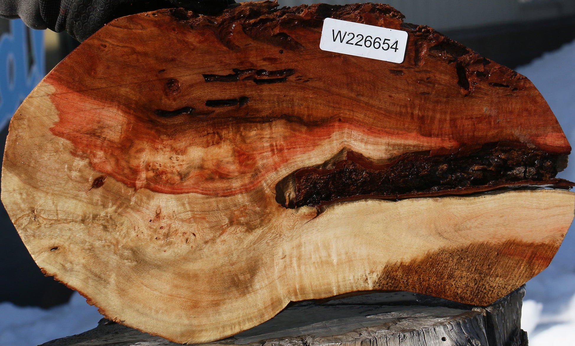 This is a colorful batch of Carob, replete with all of the easy woodworking characteristics you love when working with wood, including a high, smooth polish, easy workability, and easy sanding. The wood was cut in August of 2024. It is surfaced on two sides, kiln dried, and ready to use. An occasional check, live edge, soft spalted area, or rough corner edge may be present. Boards over 24" may have 1/16" to 1/8" bow or twist. Take advantage of this first-time lumber offer of sensational Carob wood! This piece has checks and inclusions. Please see pictures for details.