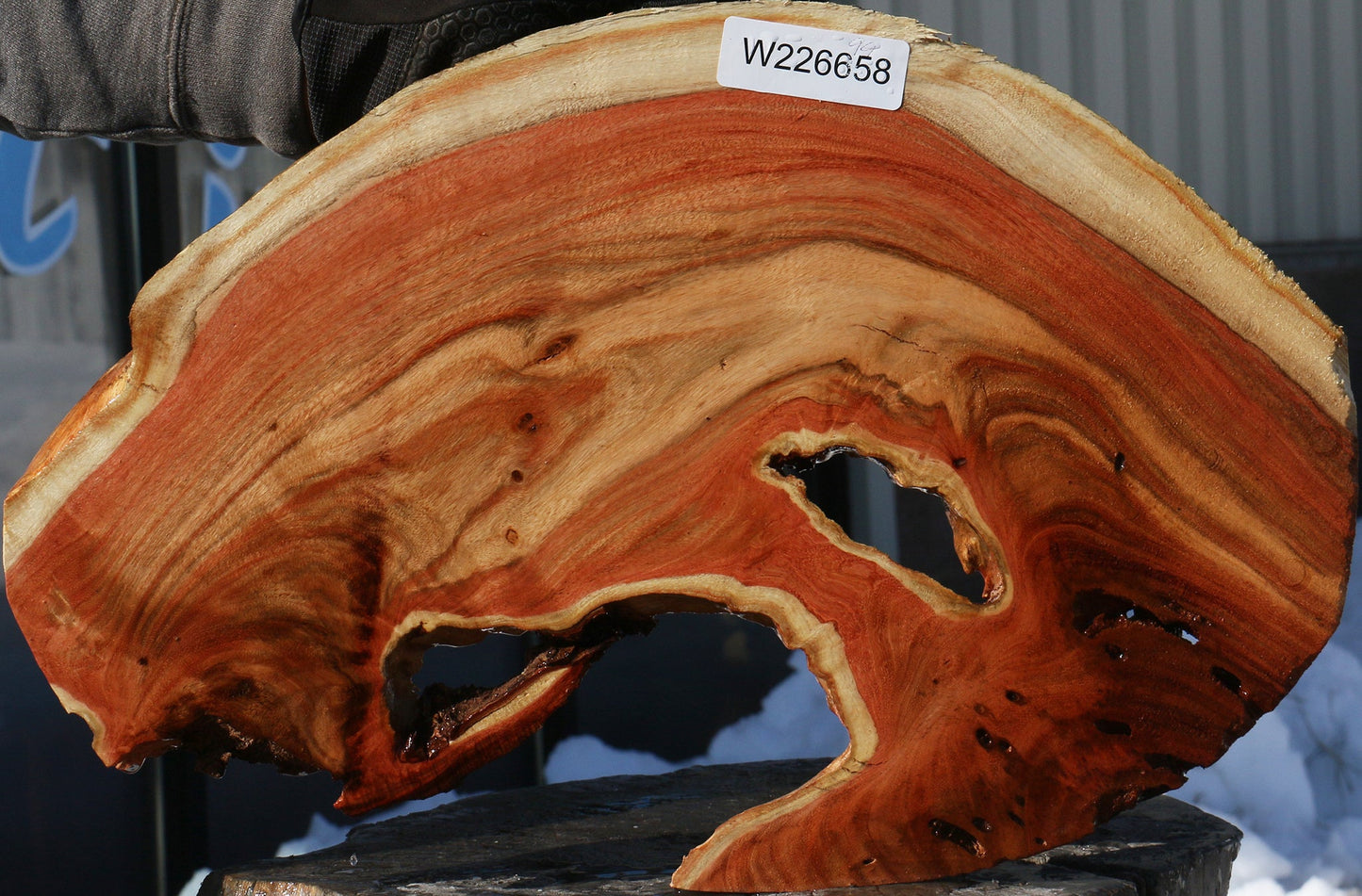 This is a colorful batch of Carob, replete with all of the easy woodworking characteristics you love when working with wood, including a high, smooth polish, easy workability, and easy sanding. The wood was cut in August of 2024. It is surfaced on two sides, kiln dried, and ready to use. An occasional check, live edge, soft spalted area, or rough corner edge may be present. Boards over 24" may have 1/16" to 1/8" bow or twist. Take advantage of this first-time lumber offer of sensational Carob wood! This piece has splits, voids, checks, and inclusions. Please see pictures for details.