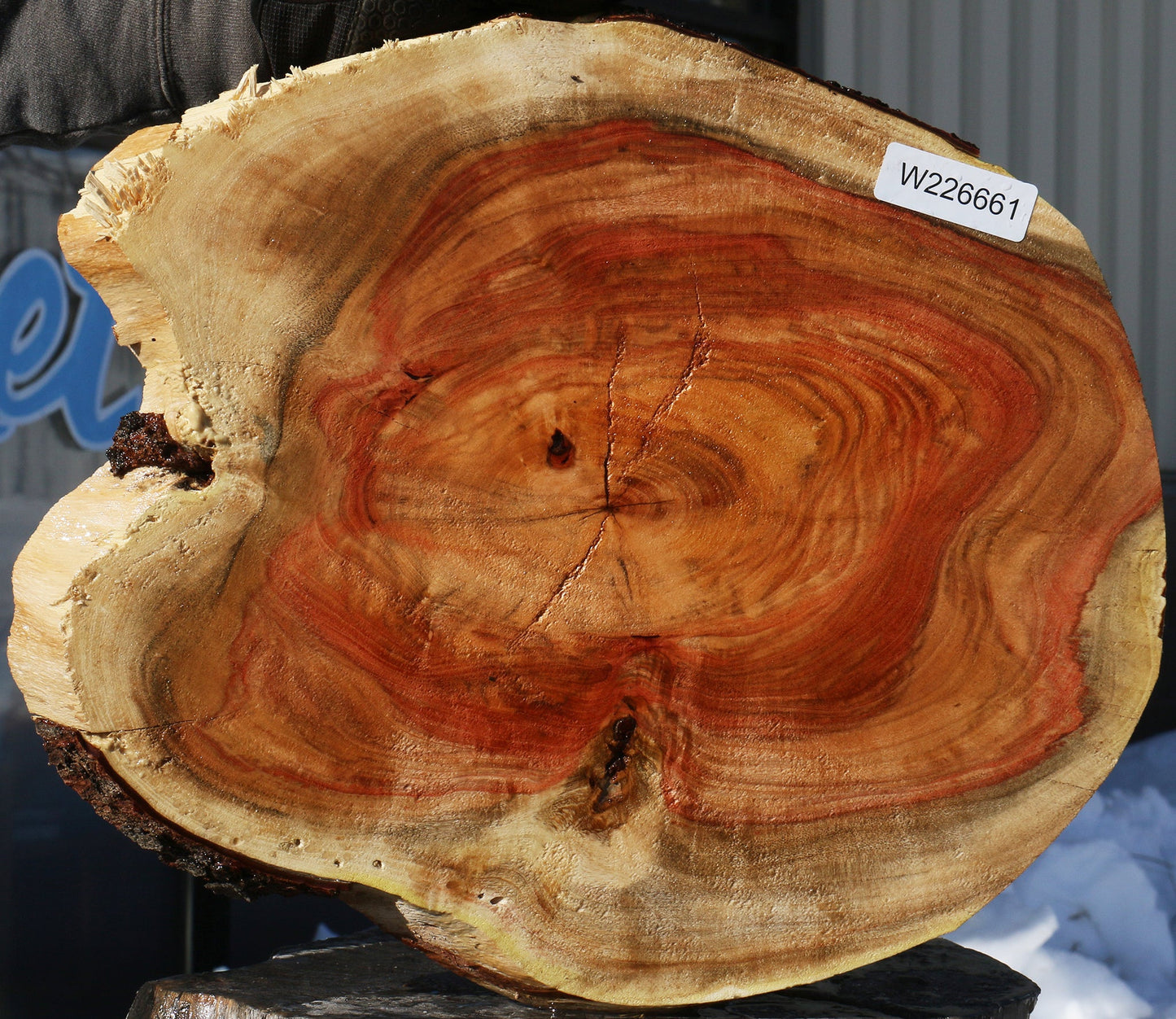 This is a colorful batch of Carob, replete with all of the easy woodworking characteristics you love when working with wood, including a high, smooth polish, easy workability, and easy sanding. The wood was cut in August of 2024. It is surfaced on two sides, kiln dried, and ready to use. An occasional check, live edge, soft spalted area, or rough corner edge may be present. Boards over 24" may have 1/16" to 1/8" bow or twist. Take advantage of this first-time lumber offer of sensational Carob wood! This piece has a void, splits, checks and inclusions. Please see pictures for details.
