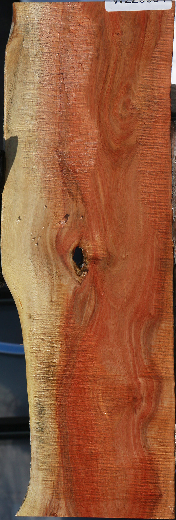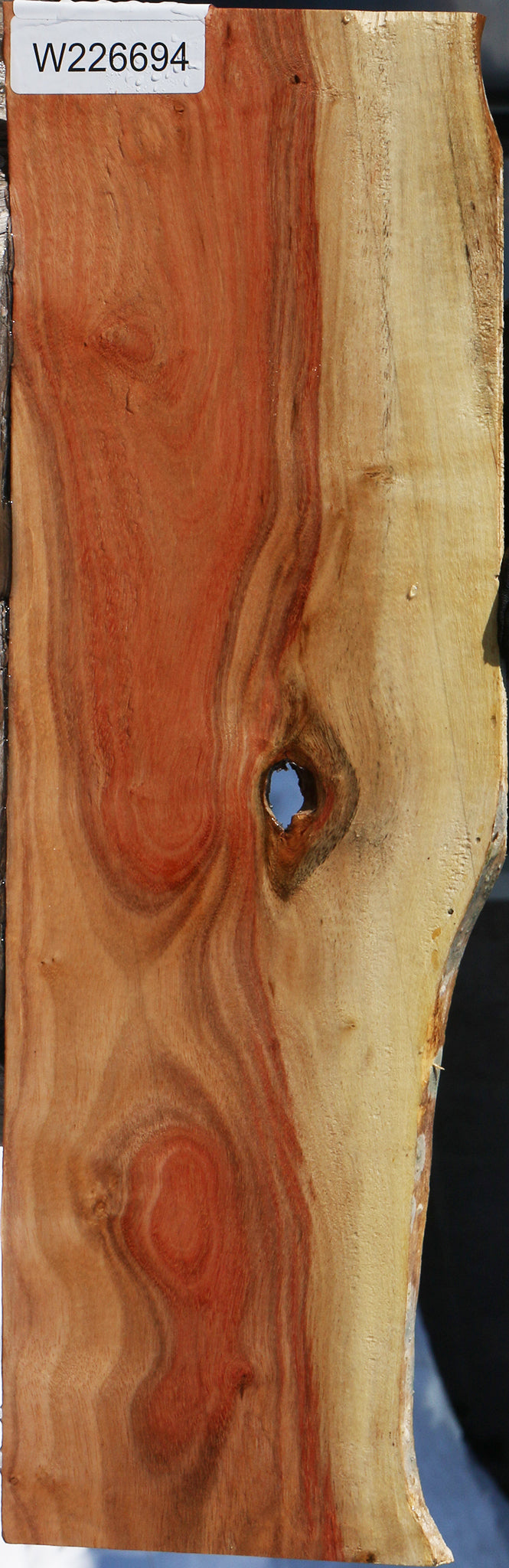 This is a colorful batch of Carob, replete with all of the easy woodworking characteristics you love when working with wood, including a high, smooth polish, easy workability, and easy sanding. The wood was cut in August of 2024. It is surfaced on two sides, kiln dried, and ready to use. An occasional check, live edge, soft spalted area, or rough corner edge may be present. Boards over 24" may have 1/16" to 1/8" bow or twist. Take advantage of this first-time lumber offer of sensational Carob wood! This piece has a void and checks. Please see pictures for details.