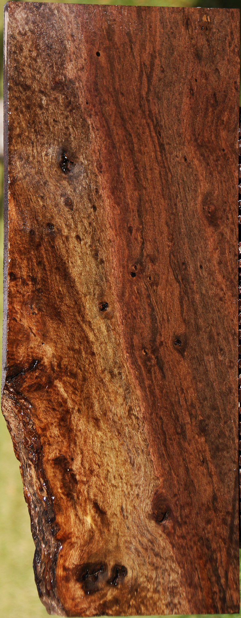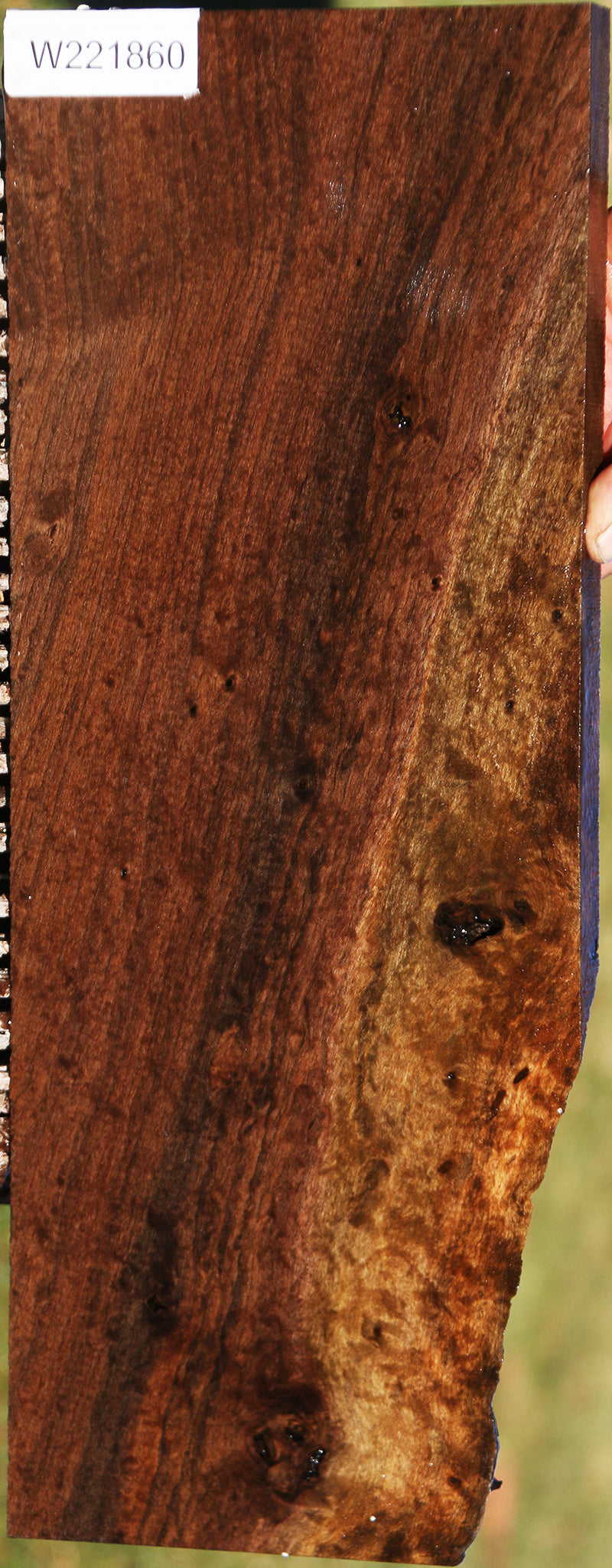 This outstanding Claro Walnut lumber has a range of great color and figure; each piece is completely unique. Some boards may have a slight 1/16” to 1/8” bow, twist, or cup but most are flat. A minor surface or end check may be present. Burl eyes may contain voids. The wood has been kiln dried, surfaced on two sides, and is ready for use. Claro Walnut is one of our most popular hardwoods for fine woodworking projects! This piece has a partial live edge, bug holes, inclusions, and checks. Please see pictures for details.