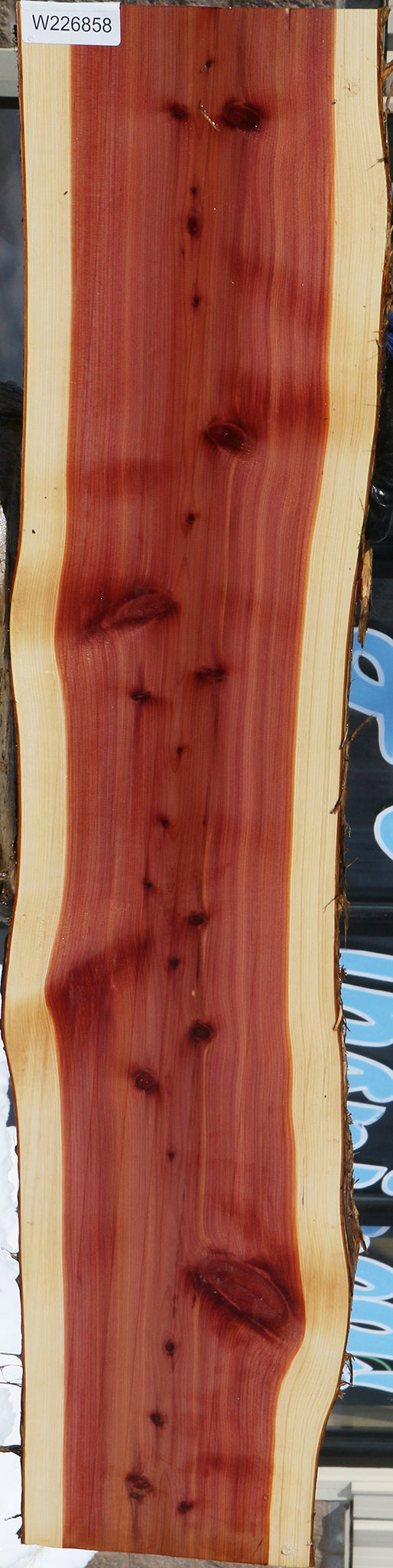 This Eastern Red Cedar is ready for your projects! It has been kiln dried and surfaced on two sides. Incorporate varying shades of beautiful color into your next woodworking project and benefit from the iconic aroma of this species. Eastern Red Cedar is easy to work with hand and power tools. Live edges with shaggy bark are present on all of the boards. A bow or twist of 1/16" to 1/8" may be present on boards over 36". Please see photos for knots, checks, and areas with bark inclusions. This piece has end checks. Please see pictures for details.