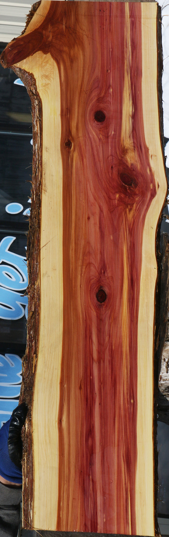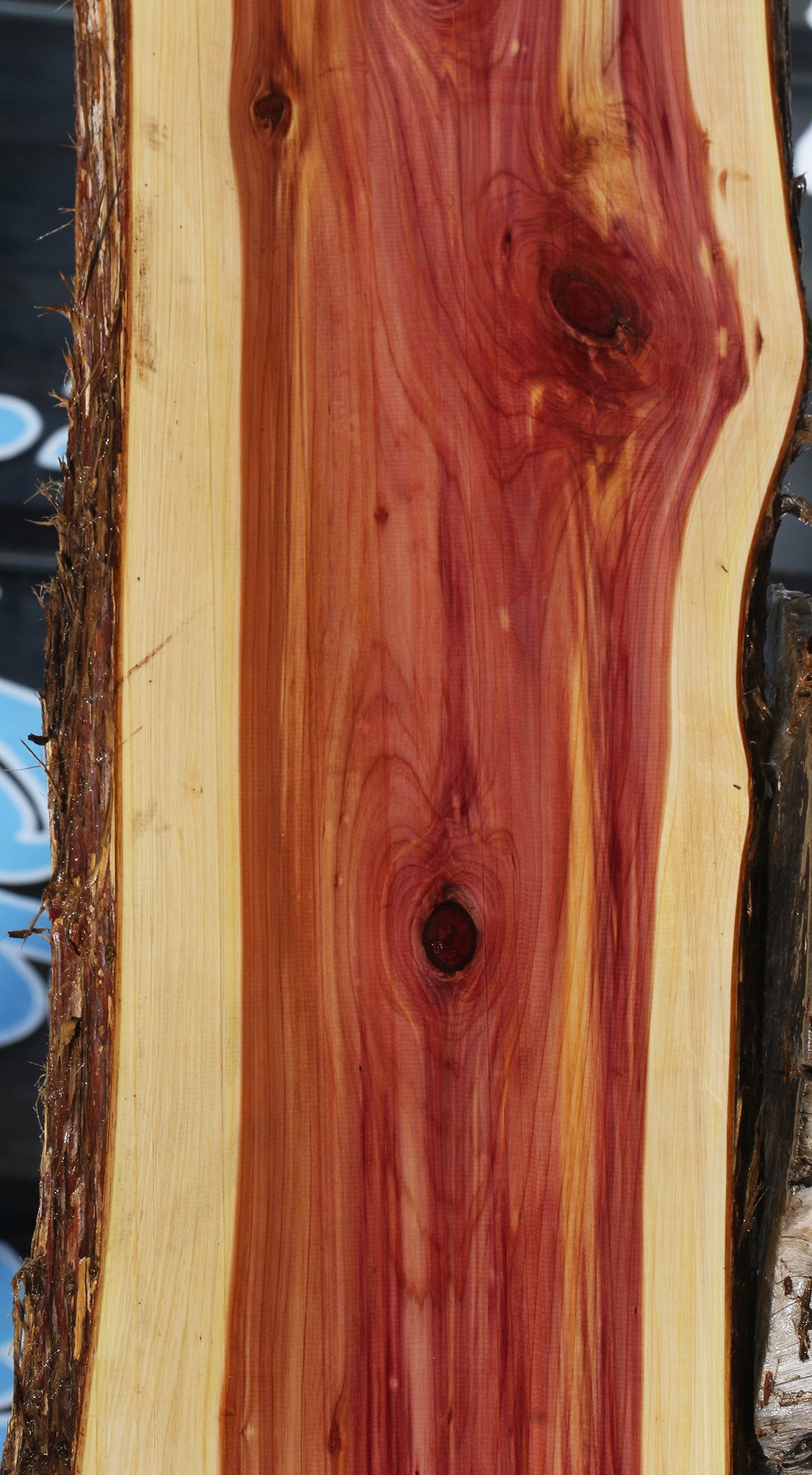 This Eastern Red Cedar is ready for your projects! It has been kiln dried and surfaced on two sides. Incorporate varying shades of beautiful color into your next woodworking project and benefit from the iconic aroma of this species. Eastern Red Cedar is easy to work with hand and power tools. Live edges with shaggy bark are present on all of the boards. A bow or twist of 1/16" to 1/8" may be present on boards over 36". Please see photos for knots, checks, and areas with bark inclusions. This piece has end splits. Please see pictures for details.