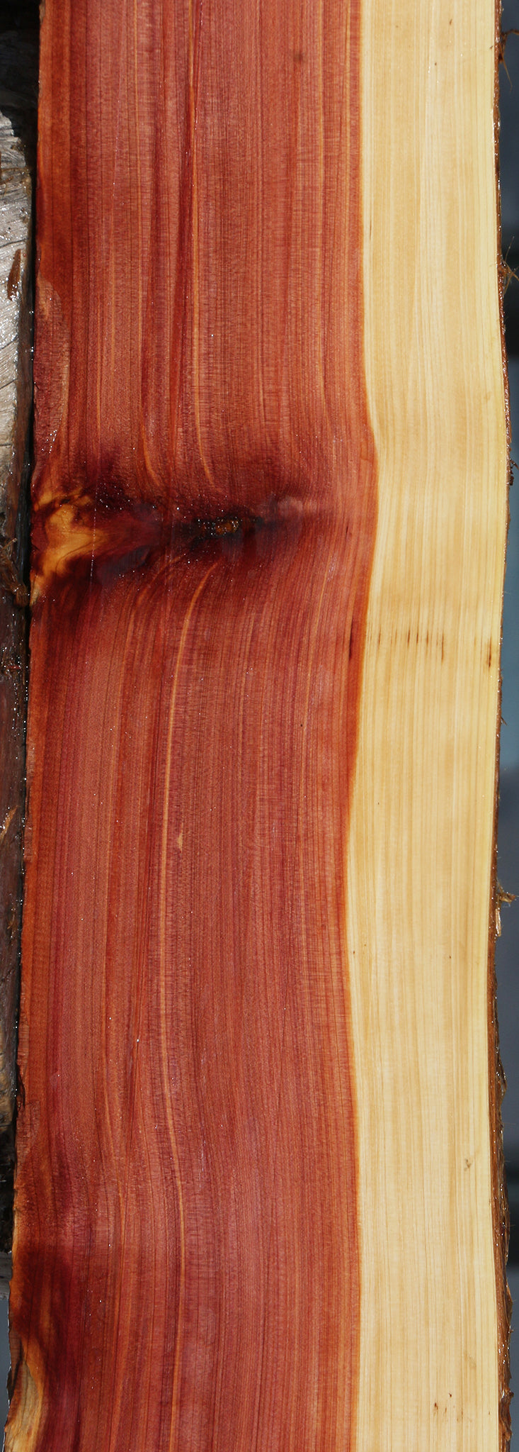 This Eastern Red Cedar is ready for your projects! It has been kiln dried and surfaced on two sides. Incorporate varying shades of beautiful color into your next woodworking project and benefit from the iconic aroma of this species. Eastern Red Cedar is easy to work with hand and power tools. Live edges with shaggy bark are present on all of the boards. A bow or twist of 1/16" to 1/8" may be present on boards over 36". Please see photos for knots, checks, and areas with bark inclusions. This piece has end splits. Please see pictures for details.