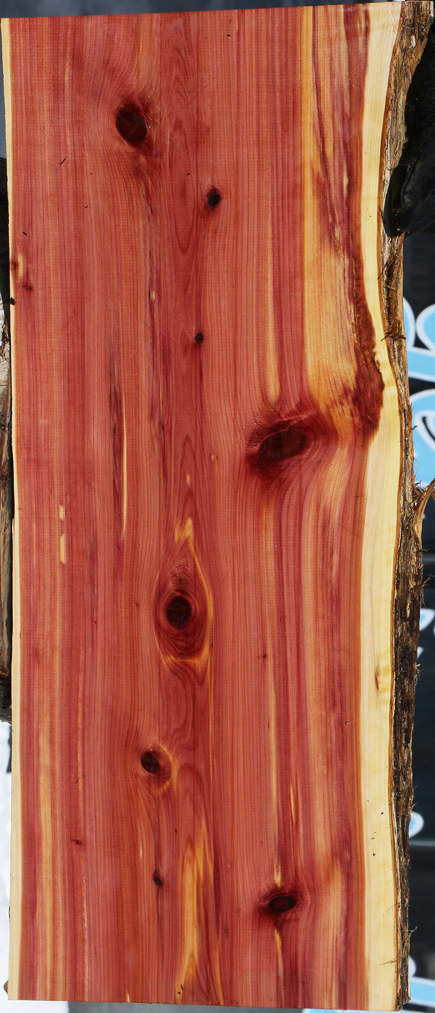 This Eastern Red Cedar is ready for your projects! It has been kiln dried and surfaced on two sides. Incorporate varying shades of beautiful color into your next woodworking project and benefit from the iconic aroma of this species. Eastern Red Cedar is easy to work with hand and power tools. Live edges with shaggy bark are present on all of the boards. A bow or twist of 1/16" to 1/8" may be present on boards over 36". Please see photos for knots, checks, and areas with bark inclusions.
