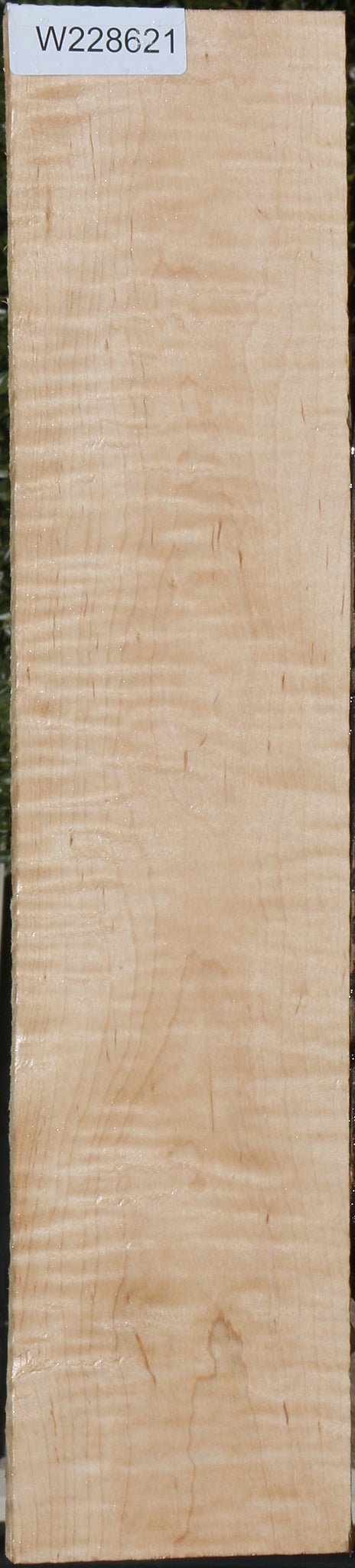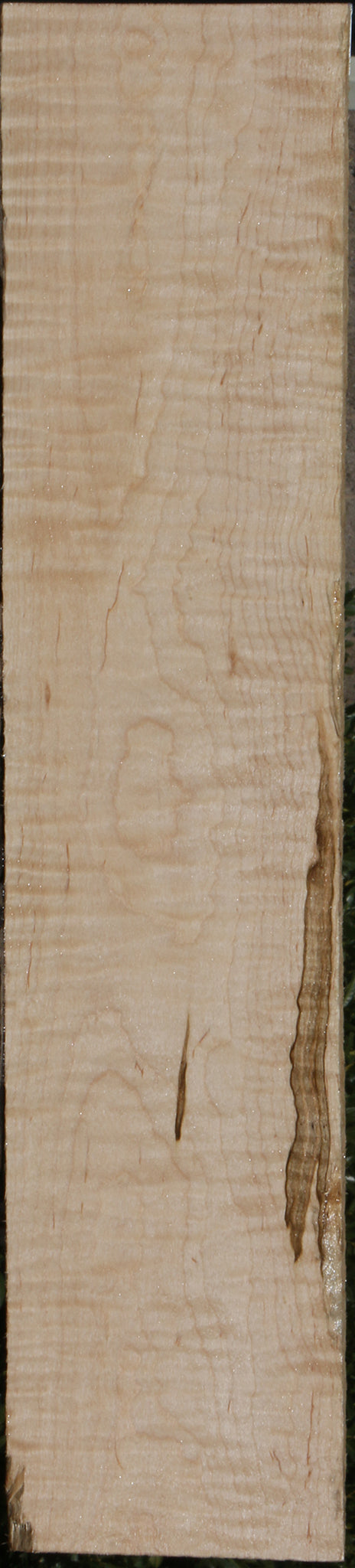 Beautifully figured, with nice color and fiddleback in most pieces, this Maple lumber is a unique hardwood that is kiln dried and ready to use. The curl will really make your woodworking projects "pop"! Boards over 36" in length may have a 1/16" to 1/8" bow or twist. An occasional small bug/pin hole may be present. Closed grain makes this Maple species easy to finish! This piece has a partial rough edge. Please see pictures for details.