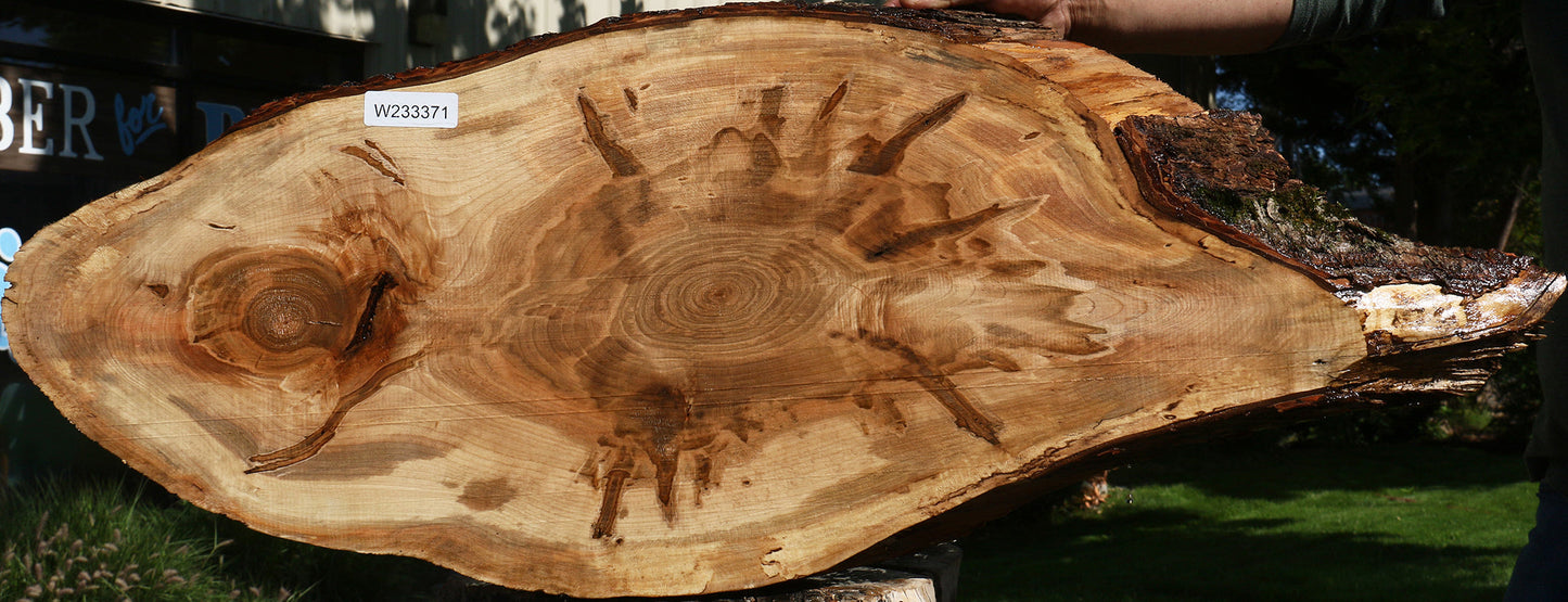 This colorful Ambrosia Maple has stunning color streaks and the possibility of fiddleback. It is a unique hardwood that is kiln dried and ready to use. The colorful ambrosia streaks are caused by the Ambrosia beetle. Some small Ambrosia beetle holes may be present. Live edges are present and may contain an occasional machine mark or check. Cookies over 20" long may have a slight 1/16" to 1/8" bow, cup, or twist. Closed grain makes this Maple species easy to finish!