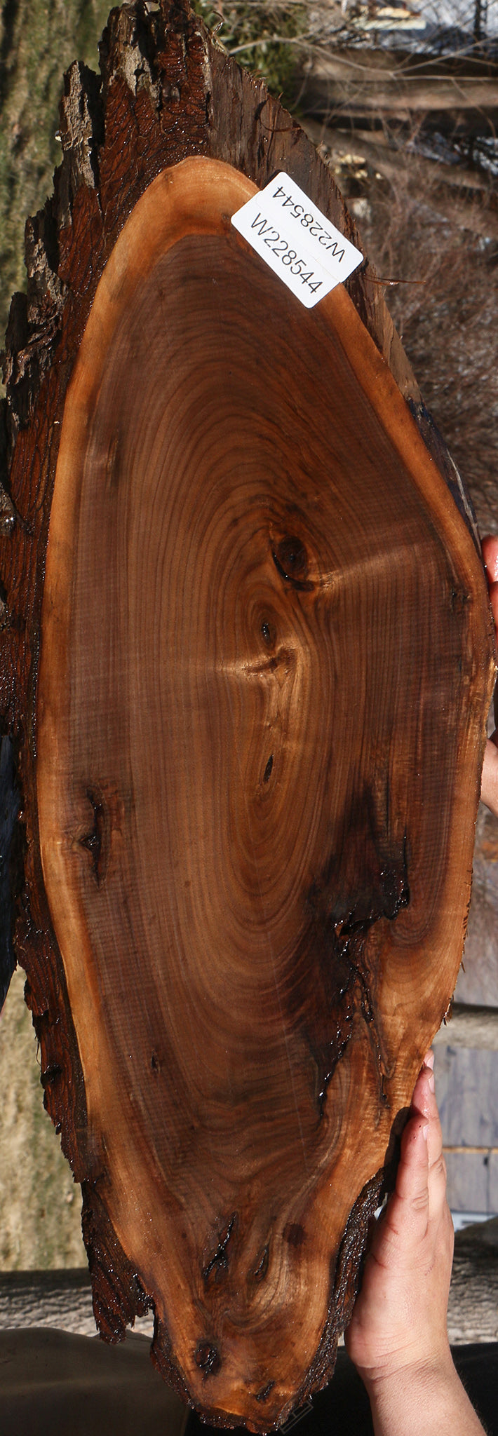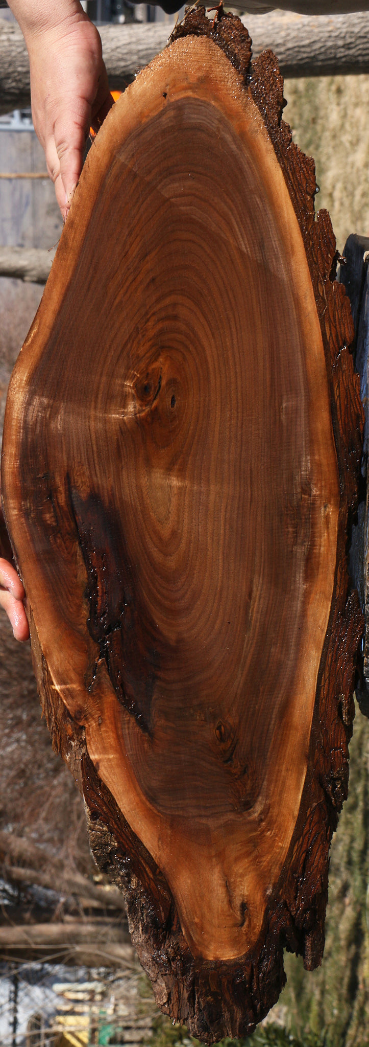 This beautiful American Black Walnut cookie is ideal for making unique woodworking projects like charcuterie boards! Occasional small end or surface checks may be present. It has been kiln dried, surfaced on two sides, and is ready to use. A slight 1/16" to 1/8" bow/twist may be found in cookies over 24" long. This wood is ideal for any special project that you have in mind! All stock is listed and the supply is limited, so shop fast! This piece has inclusions and splits. Please see pictures for details.