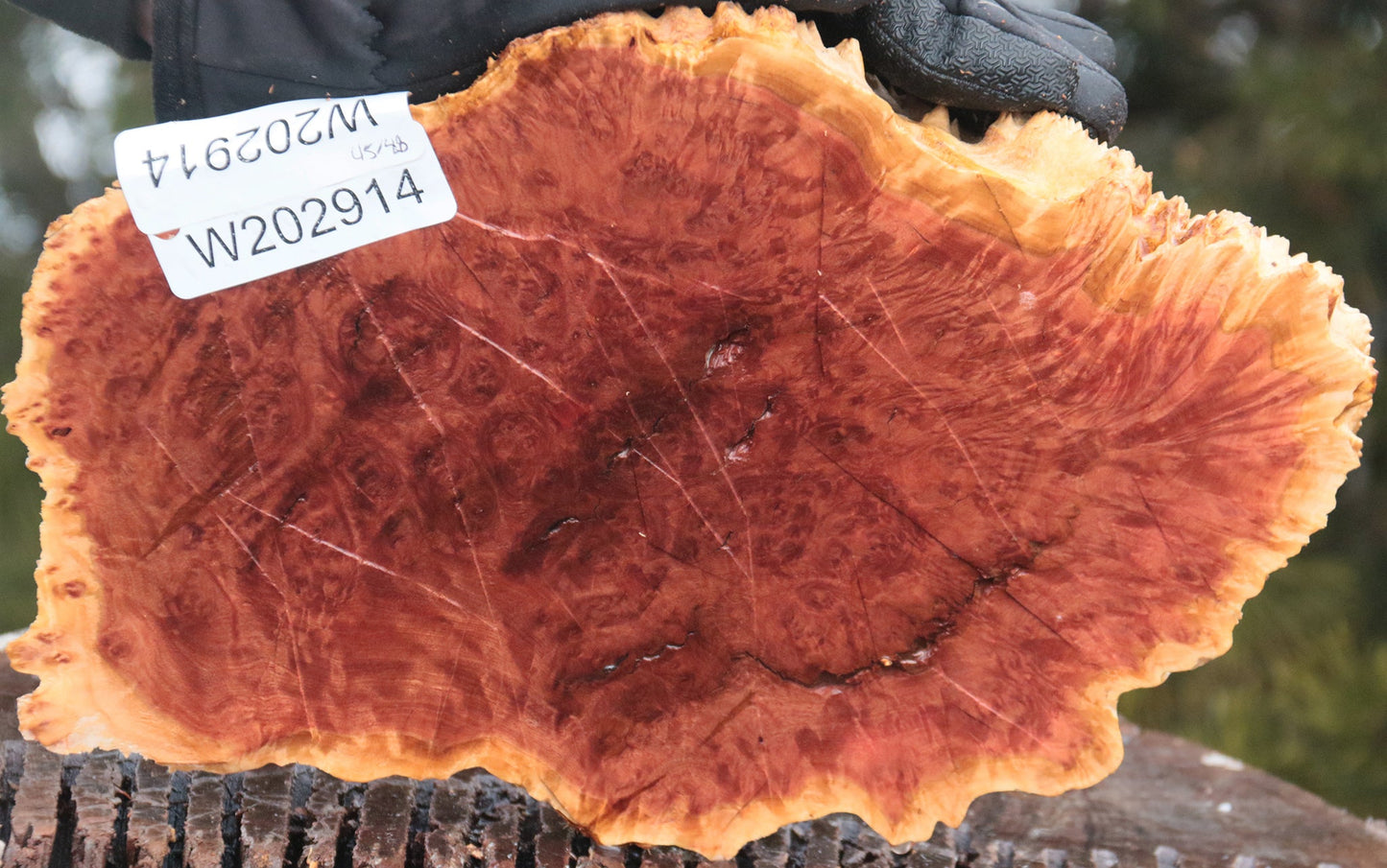 This beautiful Australian burl cap is ideal for stunning turning projects! It has been hand planed on the face. It was originally cut with a chainsaw on the face, so it may not be perfectly flat. There is residual moisture in this wood, but it has been air drying since July of 2022. Inclusions and checks are normal for this species and are not considered a defect. The wonderful live edge can be incorporated into many creative projects. This piece has checks and inclusions. Please see pictures for details.