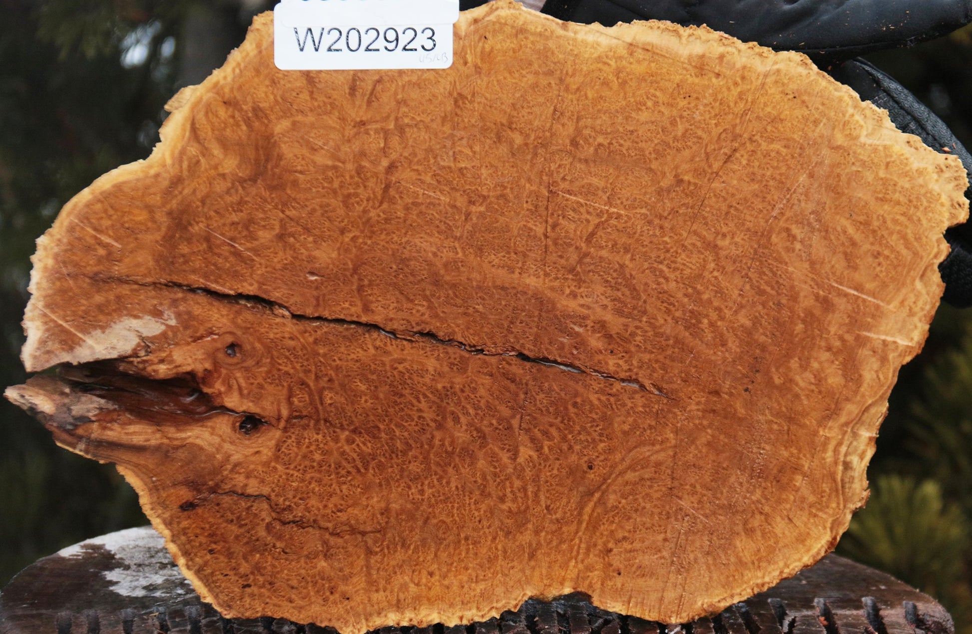 This beautiful Australian burl cap is ideal for stunning turning projects! It has been hand planed on the face. It was originally cut with a chainsaw on the face, so it may not be perfectly flat. There is residual moisture in this wood, but it has been air drying since July of 2022. Inclusions and checks are normal for this species and are not considered a defect. The wonderful live edge can be incorporated into many creative projects. This piece has checks, inclusions, and splits. Please see pictures for details.