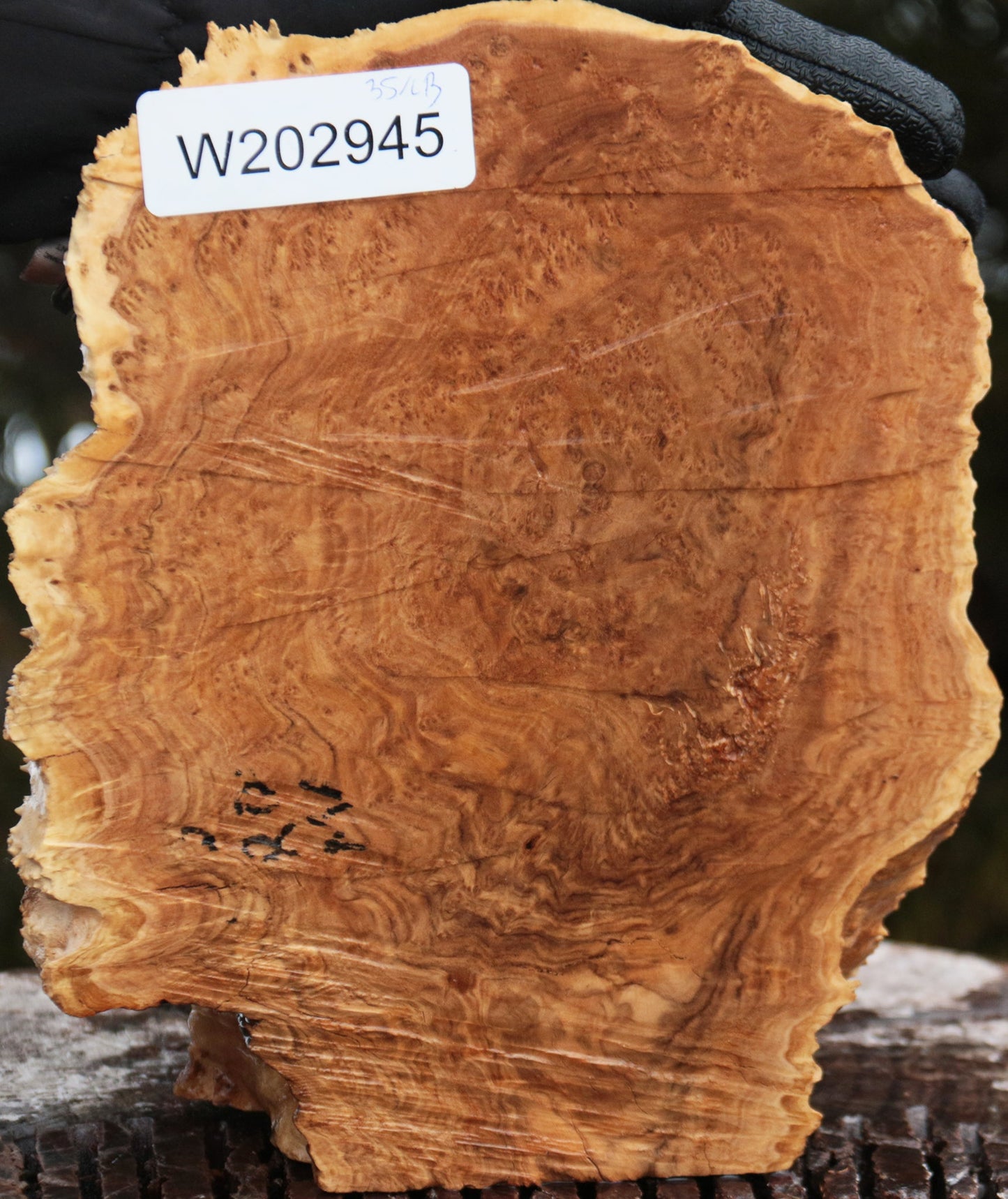 This beautiful Australian burl cap is ideal for stunning turning projects! It has been hand planed on the face. It was originally cut with a chainsaw on the face, so it may not be perfectly flat. There is residual moisture in this wood, but it has been air drying since July of 2022. Inclusions and checks are normal for this species and are not considered a defect. The wonderful live edge can be incorporated into many creative projects. This piece has an end check, soft spalt, and inclusions. Please see pictures for details.