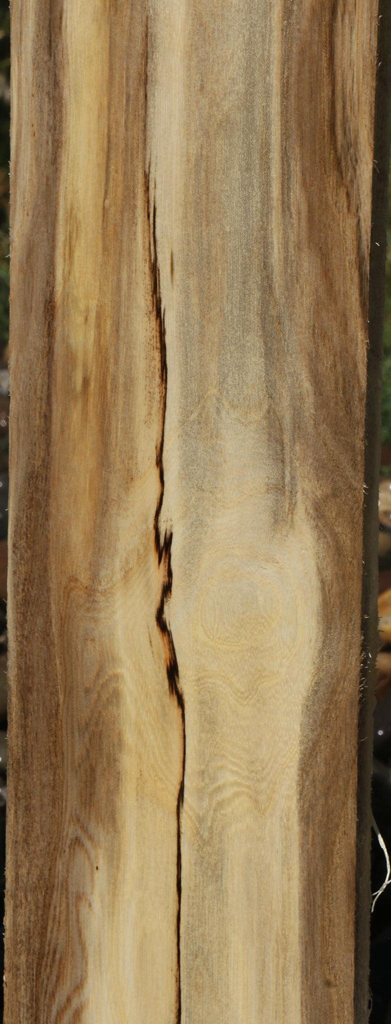 Hackberry has closed grain and shows fine, intricate patterns upon close examination. This wood was cut from a unique tree with strong black irregular grain in the heartwood. It is not truly spalted as the name implies, but looks very similar to spalting in other species, so this term is the most easily understood for describing the black veins that run through the wood. This lumber is kiln dried and surfaced on two sides. It is free of checks and other defects. There may be minor surface checks or a slight 1/8" bow or twist in boards over 36" long. This high quality wood is brimming with possibilities! This piece has inclusions. Please see pictures for details.