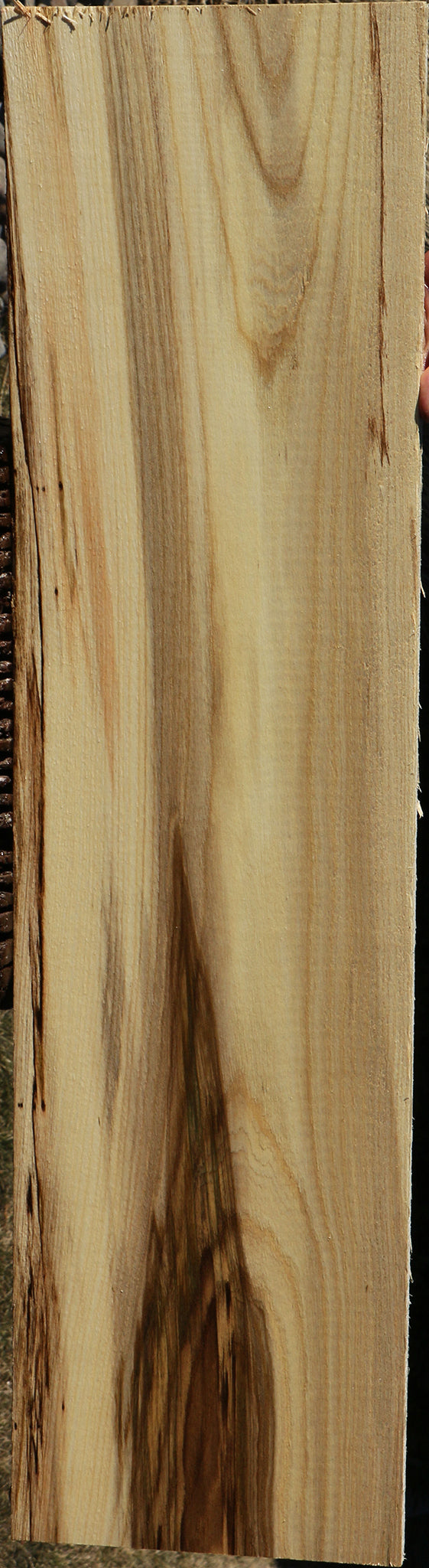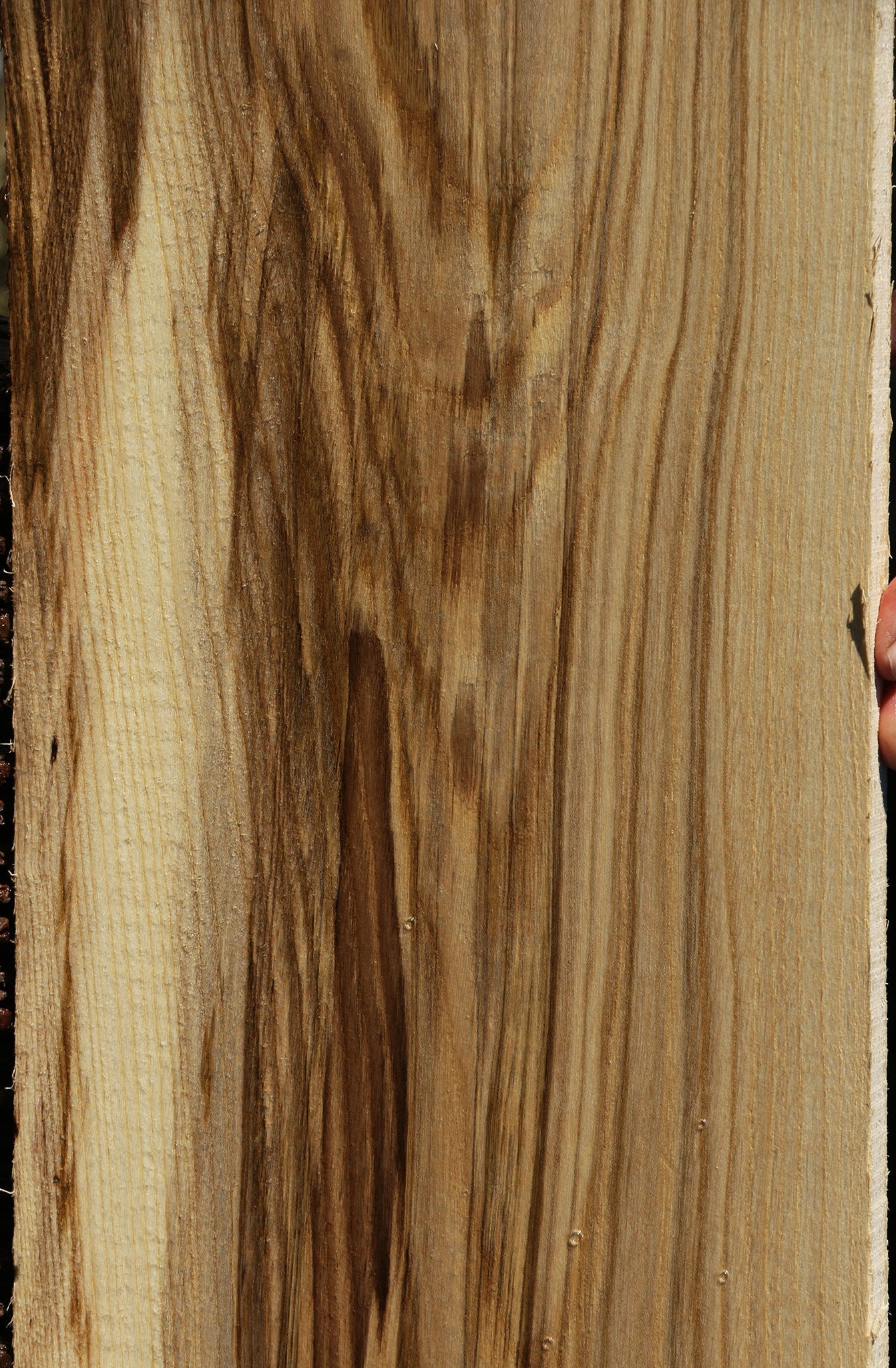 Hackberry has closed grain and shows fine, intricate patterns upon close examination. This wood was cut from a unique tree with strong black irregular grain in the heartwood. It is not truly spalted as the name implies, but looks very similar to spalting in other species, so this term is the most easily understood for describing the black veins that run through the wood. This lumber is kiln dried and surfaced on two sides. There may be worm holes and minor surface checks. A slight 1/8" bow or twist may be present in boards over 36" long. This high quality wood is brimming with possibilities! This piece has bug holes. Please see pictures for details.