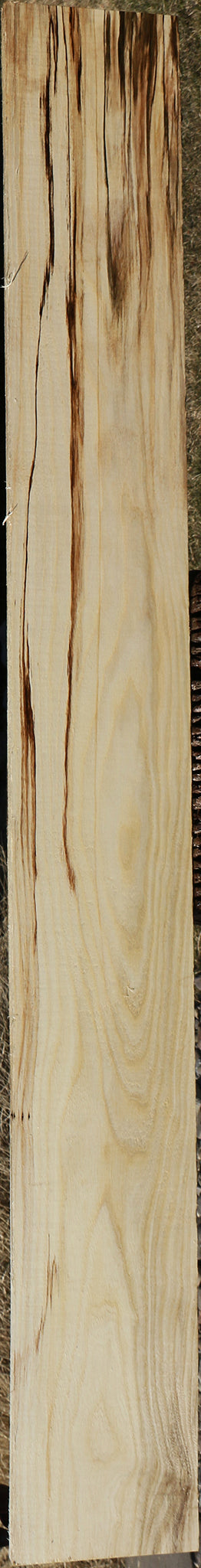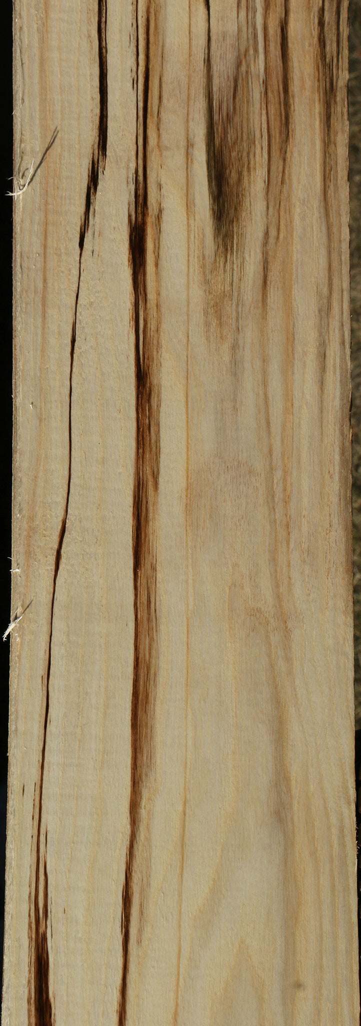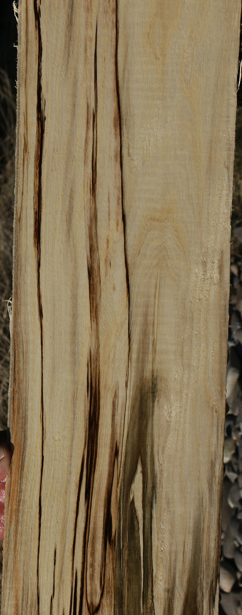 Hackberry has closed grain and shows fine, intricate patterns upon close examination. This wood was cut from a unique tree with strong black irregular grain in the heartwood. It is not truly spalted as the name implies, but looks very similar to spalting in other species, so this term is the most easily understood for describing the black veins that run through the wood. This lumber is kiln dried and surfaced on two sides. There may be worm holes and minor surface checks. A slight 1/8" bow or twist may be present in boards over 36" long. This high quality wood is brimming with possibilities! This piece has bug holes. Please see pictures for details.