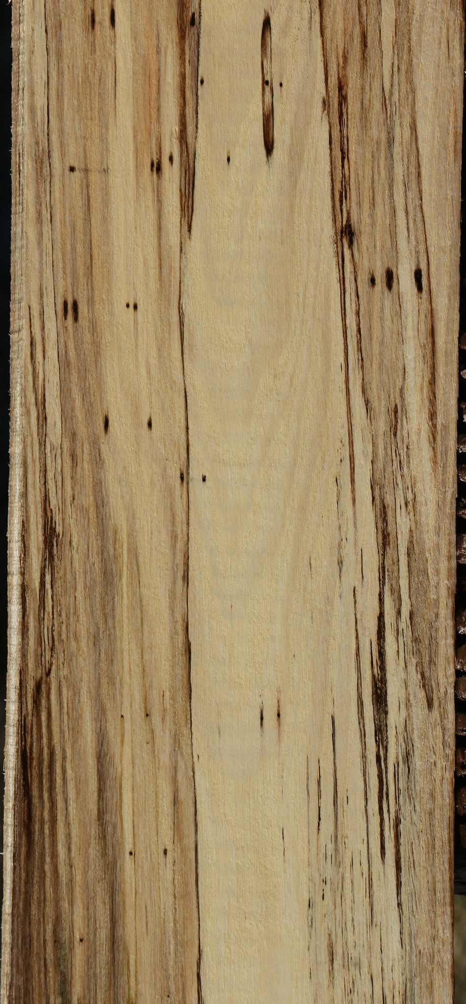 Hackberry has closed grain and shows fine, intricate patterns upon close examination. This wood was cut from a unique tree with strong black irregular grain in the heartwood. It is not truly spalted as the name implies, but looks very similar to spalting in other species, so this term is the most easily understood for describing the black veins that run through the wood. This lumber is kiln dried and surfaced on two sides. There may be worm holes and minor surface checks. A slight 1/8" bow or twist may be present in boards over 36" long. This high quality wood is brimming with possibilities! This piece has bug holes and pin holes. Please see pictures for details.
