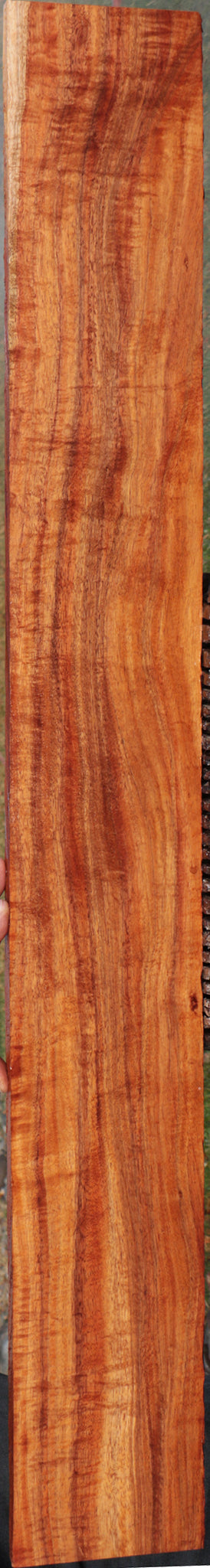 This vintage Hawaiian Koa lumber has warm, rich colors with unrivaled iridescence and curl. An occasional bug hole or check may be present. Some pieces may have pin holes in the sapwood or a bow/twist that will lay flat with minimal pressure. This wonderful Koa is kiln dried, surfaced on two sides, and is ready to use. Beautiful curly figure will vary from piece to piece. This is some of the finest color and figure we’ve seen in years. It was saved from a stash that was cut in 1986. This Koa is a rare treasure! This piece has knots and inclusions. Please see pictures for details.