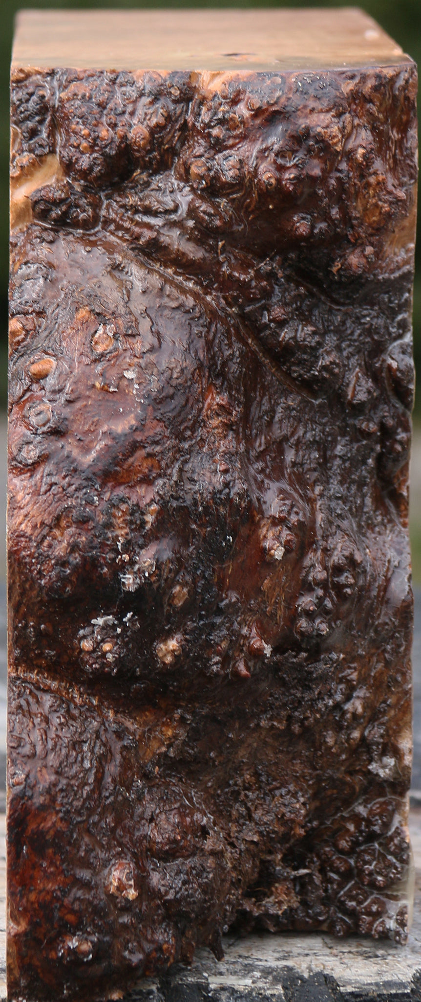 Kanista is a unique tropical species from Central America. The tree produces an egg shaped fruit that is wonderful for the human immune system and vision. The wood is dense and the burl has beautiful grain patterns, figure and eyes. Checks, inclusions, voids, and live edges may be present and are not considered defects. This rare hardwood burl is ideal for small, fine woodworking articles such as knives, pens, jewelry boxes, wood bowls, and more. This has been air dried for 4 years. Most stock is dry and ready to use, but residual moisture may be present in blanks over 2.5" thick.