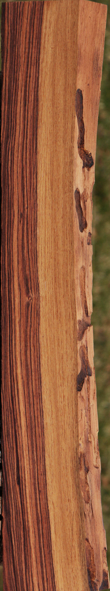 This is probably the last batch of Kingwood that we will ever have available. Kingwood, the wood of Kings, is a true Rosewood. It has rich & regal purple/black color with interesting golden and white sapwood contrast. It is dense (.98 to 1.2 specific gravity) and takes an incredibly high natural polish. This lumber has been carefully kiln dried and surfaced on two sides. There may be a rustic live edge with machete cuts and an occasional check may also be present. It is normal for live edge boards to have checks in the sapwood that may slightly penetrate the heartwood. Overall it is very clean material. This ships to the USA only! This piece has checks. Please see pictures for details.