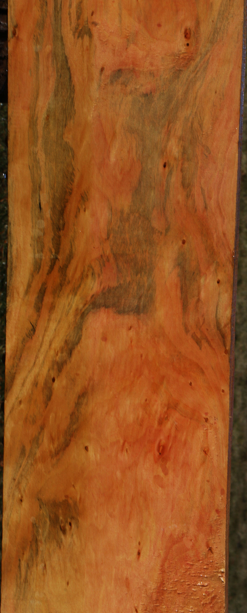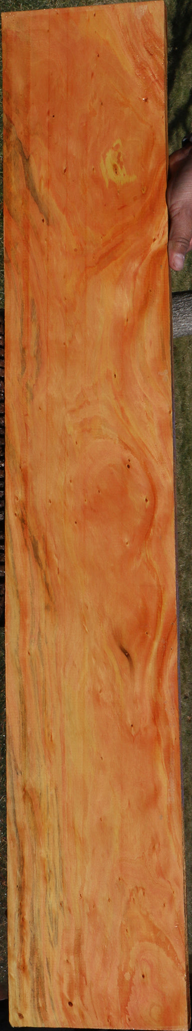 Kiln dried and surfaced on two sides, this beautiful South American Kirandy has fine woodworking properties. There may be an occasional surface or end check. Boards over 36" may have a slight bow or twist up to 1/8" but they are generally flat. This lesser known hardwood works well and glues satisfactorily. Colors range from vivid yellow to reddish pink streaks and mottled figure. Try this out for your next woodworking project! This piece has bug holes and planer skip. Please see pictures for details.