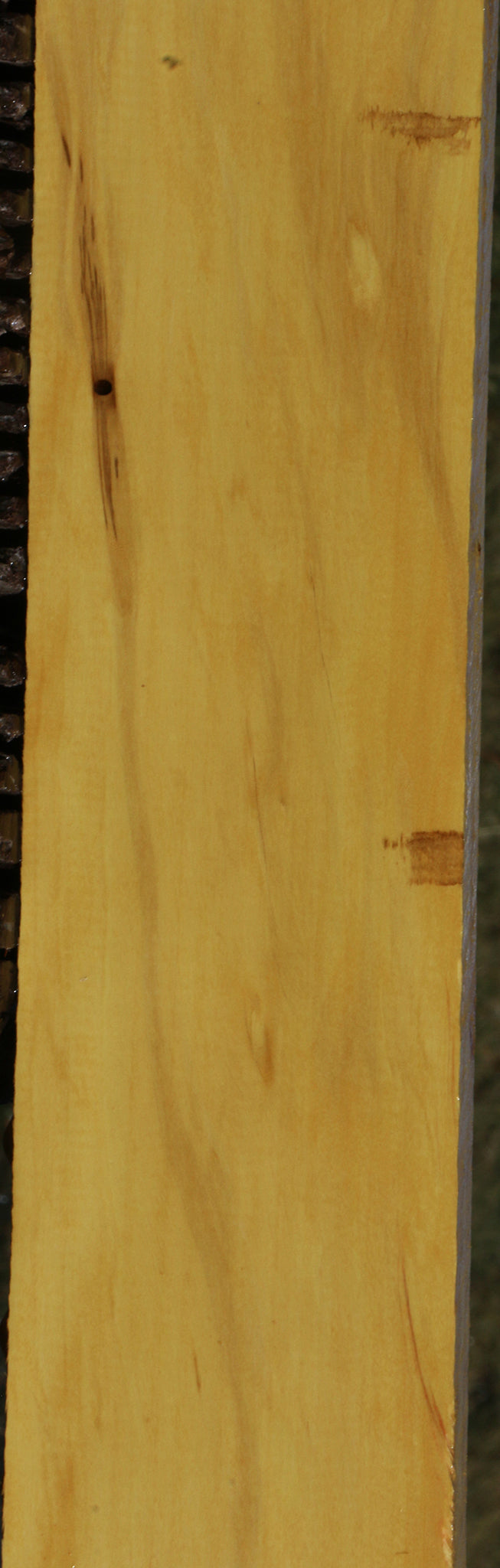 Kiln dried and surfaced on two sides, this beautiful South American Kirandy has fine woodworking properties. There may be an occasional surface or end check. Boards over 36" may have a slight bow or twist up to 1/8" but they are generally flat. This lesser known hardwood works well and glues satisfactorily. Colors range from vivid yellow to reddish pink streaks and mottled figure. Try this out for your next woodworking project! This piece has bug holes. Please see pictures for details.