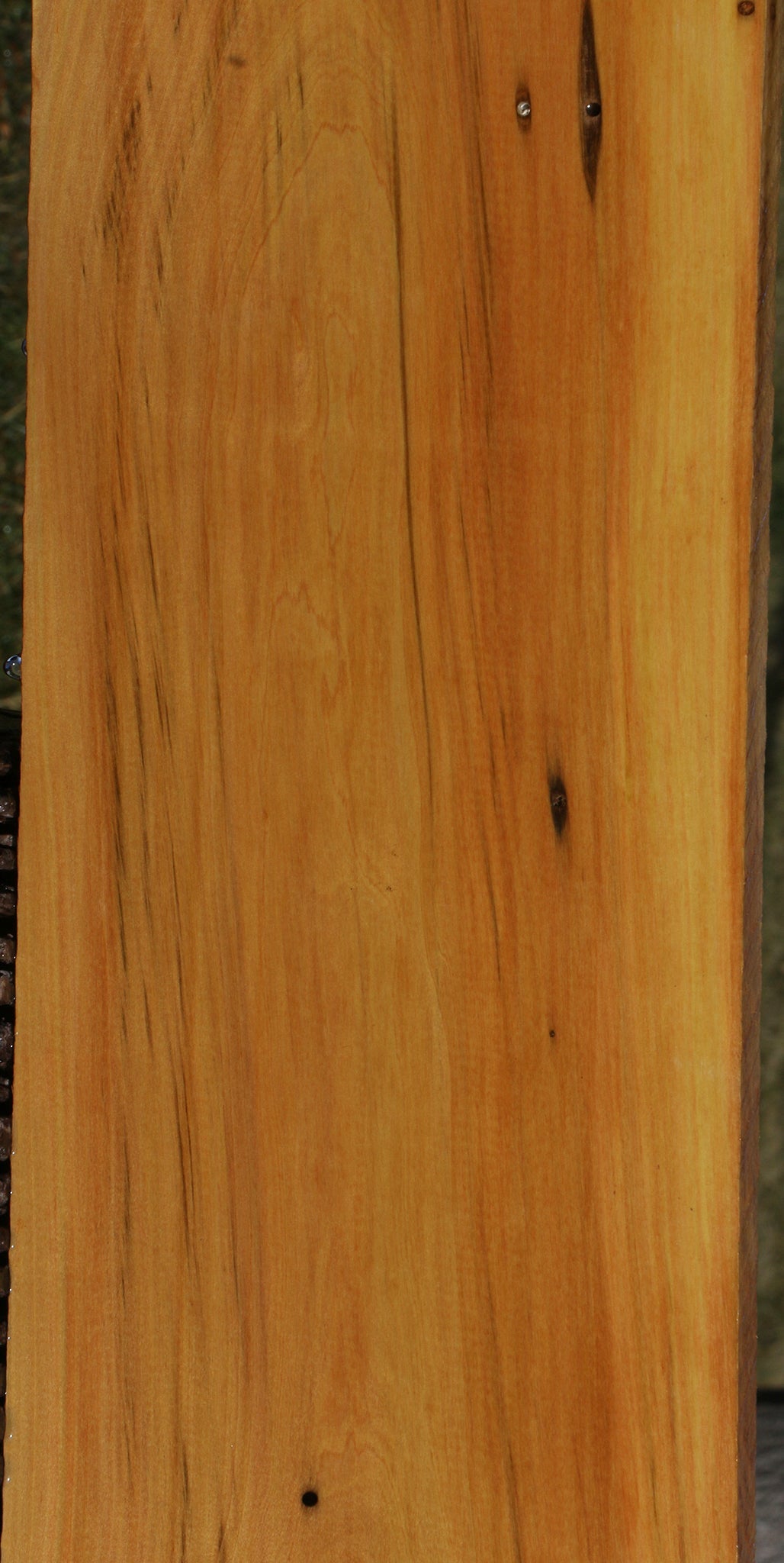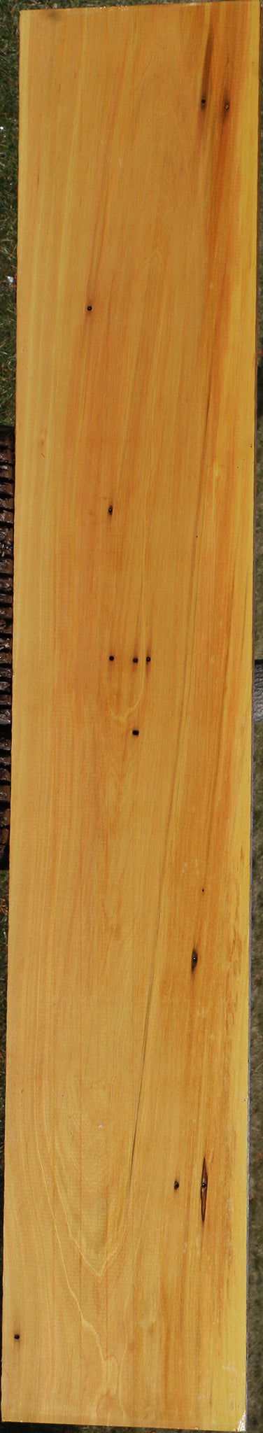 Kiln dried and surfaced on two sides, this beautiful South American Kirandy has fine woodworking properties. There may be an occasional surface or end check. Boards over 36" may have a slight bow or twist up to 1/8" but they are generally flat. This lesser known hardwood works well and glues satisfactorily. Colors range from vivid yellow to reddish pink streaks and mottled figure. Try this out for your next woodworking project! This piece has bug holes. Please see pictures for details.