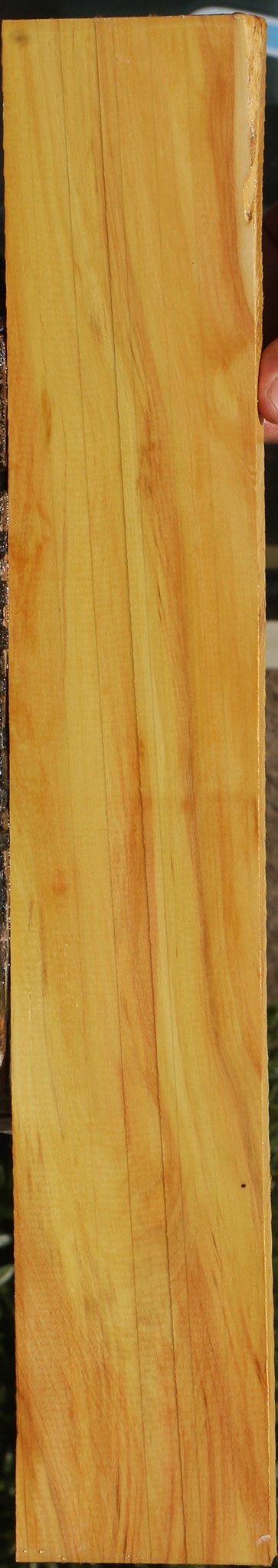 Kiln dried and surfaced on two sides, this beautiful South American Kirandy has fine woodworking properties. There may be an occasional surface or end check. Boards over 36" may have a slight bow or twist up to 1/8" but they are generally flat. This lesser known hardwood works well and glues satisfactorily. Colors range from vivid yellow to reddish pink streaks and mottled figure. Try this out for your next woodworking project! This piece has worm holes. Please see pictures for details.