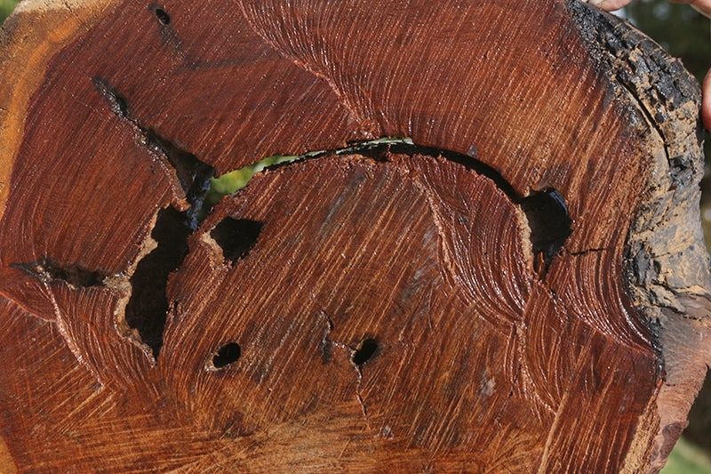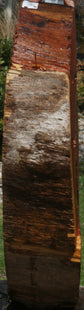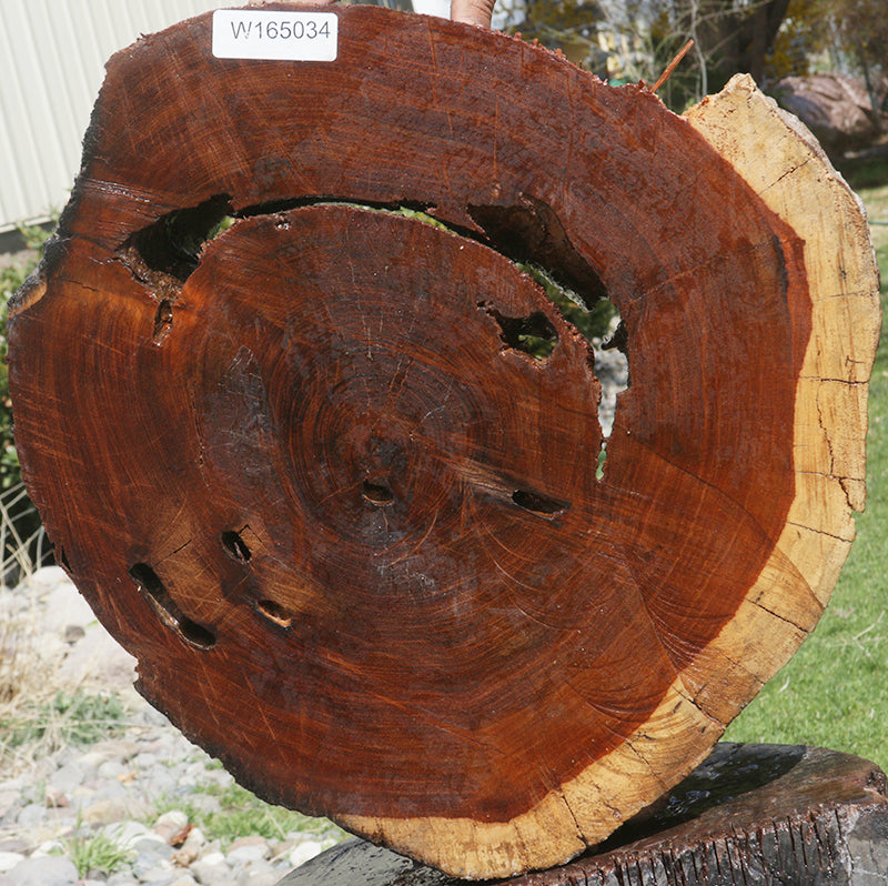 Macacauba works easily and glues well. It takes an exceptionally high polish when finished. This wood is air dried and sanded on two sides. The thickness can vary. Please see measurement for details. Live edges can be present and often contain checks and cracks. Please see photos for voids and larger defects and inquire before purchasing if extra details are needed. Rounds/cookies/part of cookies were cut with a chainsaw. One face may be rough and the other sanded. Occasional both faces are rough. This beautiful exotic hardwood is ready for your unique woodworking projects! This piece has an irregular chainsaw cut on one face and large voids.