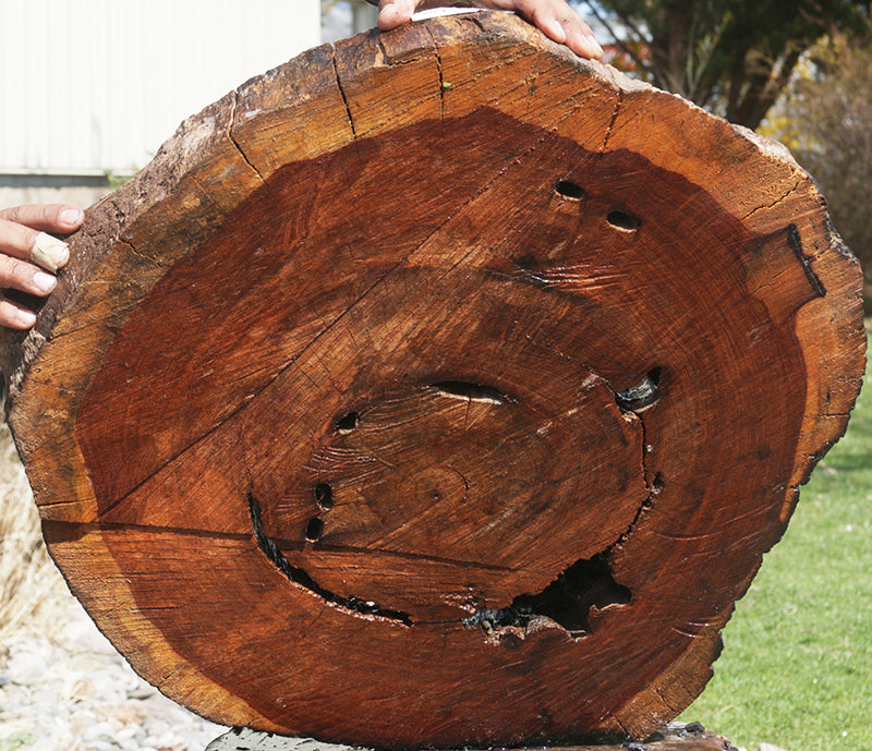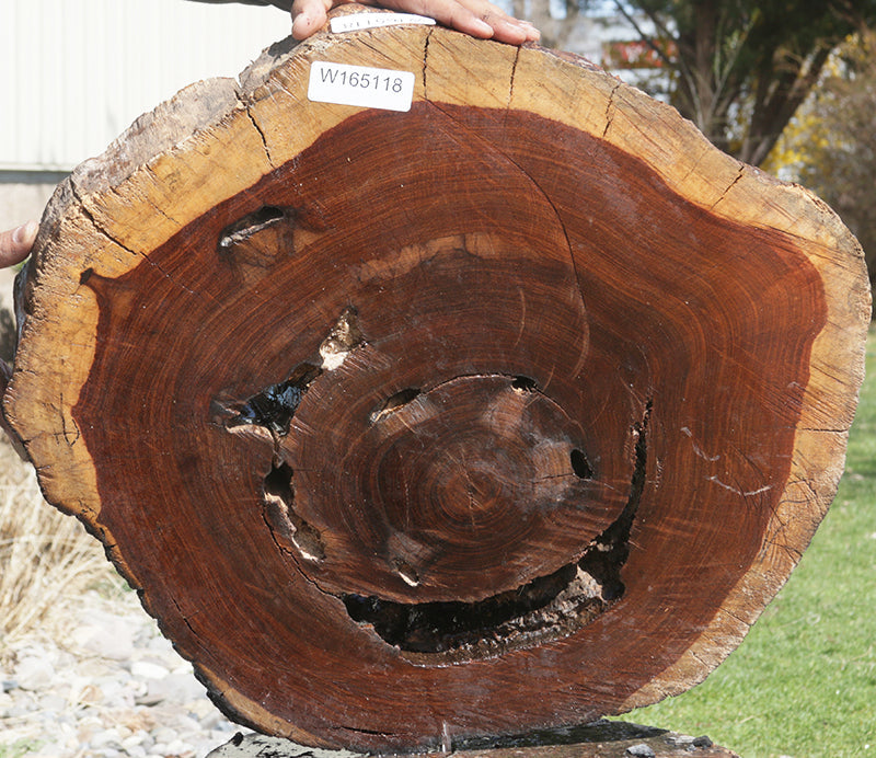 Macacauba works easily and glues well. It takes an exceptionally high polish when finished. This wood is air dried and sanded on two sides. The thickness can vary. Please see measurement for details. Live edges can be present and often contain checks and cracks. Please see photos for voids and larger defects and inquire before purchasing if extra details are needed. Rounds/cookies/part of cookies were cut with a chainsaw. One face may be rough and the other sanded. Occasional both faces are rough. This beautiful exotic hardwood is ready for your unique woodworking projects! This piece has checks. Please see picture for details.