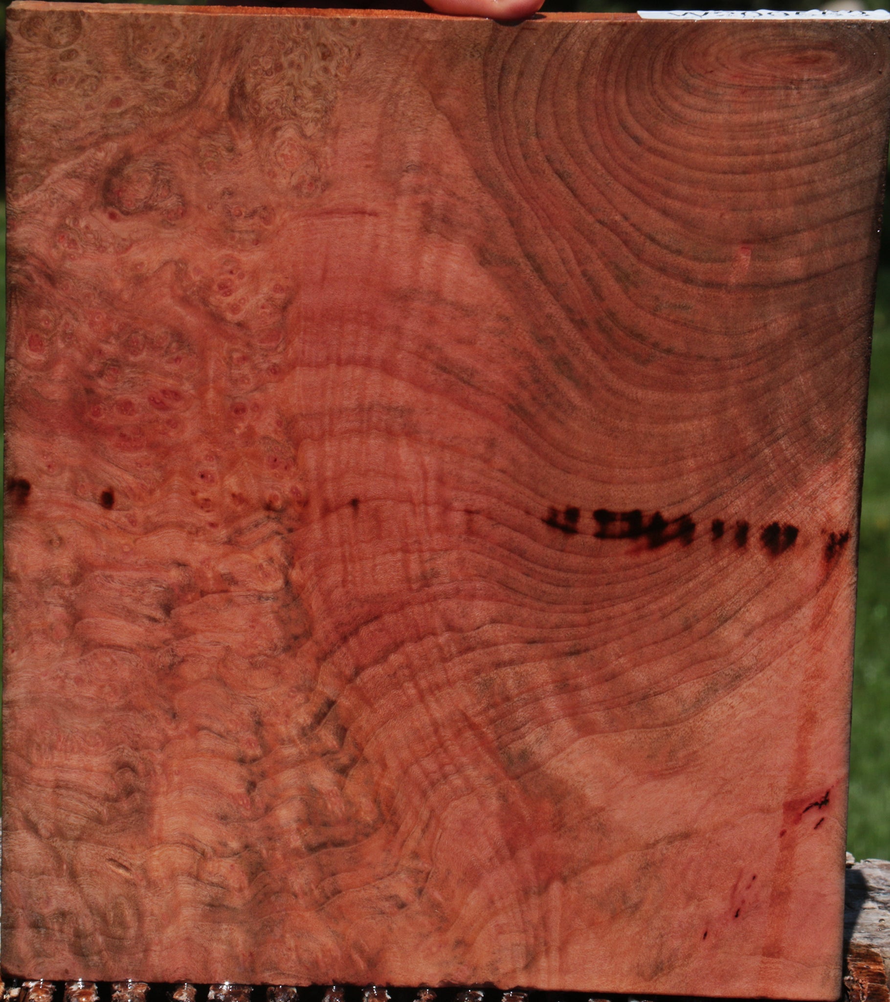 This Madrone burl lumber has pinkish brown color and lots of interesting grain! Dark red streaks might be present in some pieces. Madrone is a Pacific Northwest hardwood that is very easy to work with and finish. This burl was pressure cooked and vacuum kiln dried. The internal stress has been removed through the pressure cooking process. An occasional surface or edge check may be present. Checks or inclusions are normal in the burl eyes. If black color is present on the surface of the board, it usually does not penetrate further than 1/2". This is a gorgeous species that is ideal for many woodworking projects! This piece has checks and inclusions. Please see pictures for details.