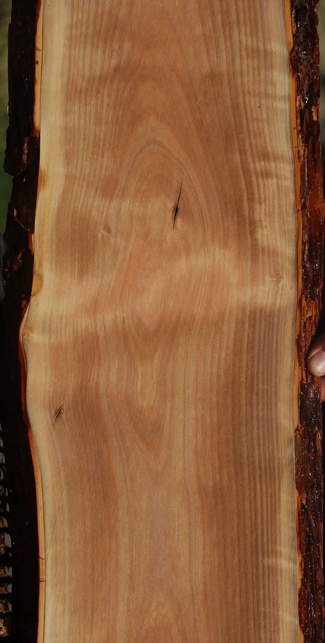 This Madrone lumber has pinkish brown color and lots of interesting grain! Dark red streaks might be present in some pieces. Madrone is a Pacific Northwest hardwood that is very easy to work with and finish. This wood is pressure cooked and vacuum kiln dried. The internal stress has been removed through the pressure cooking process. An occasional surface or edge check may be present. 1/16" to 1/8" bow or twist may be present in boards 36" and longer. This is a gorgeous species that is ideal for many woodworking projects! This piece is great for a charcuterie board. It contains a live edge, splits, checks, inclusions, and planer skip. Please see pictures for details.