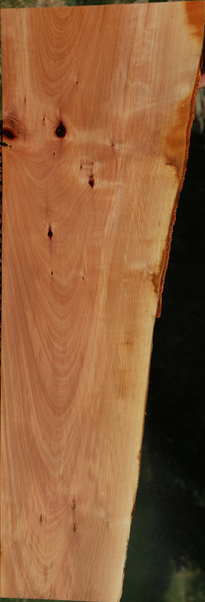 This Madrone lumber has pinkish brown color and lots of interesting grain! Dark red streaks might be present in some pieces. Madrone is a Pacific Northwest hardwood that is very easy to work with and finish. This wood is pressure cooked and vacuum kiln dried. The internal stress has been removed through the pressure cooking process. An occasional surface or edge check may be present. 1/16" to 1/8" bow or twist may be present in boards 36" and longer. This is a gorgeous species that is ideal for many woodworking projects! This board has a live edge, splits, checks, inclusions, knots, and planer skip. Please see pictures for details.