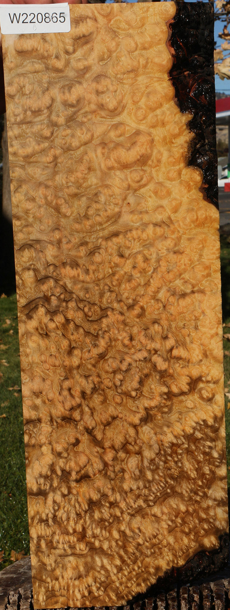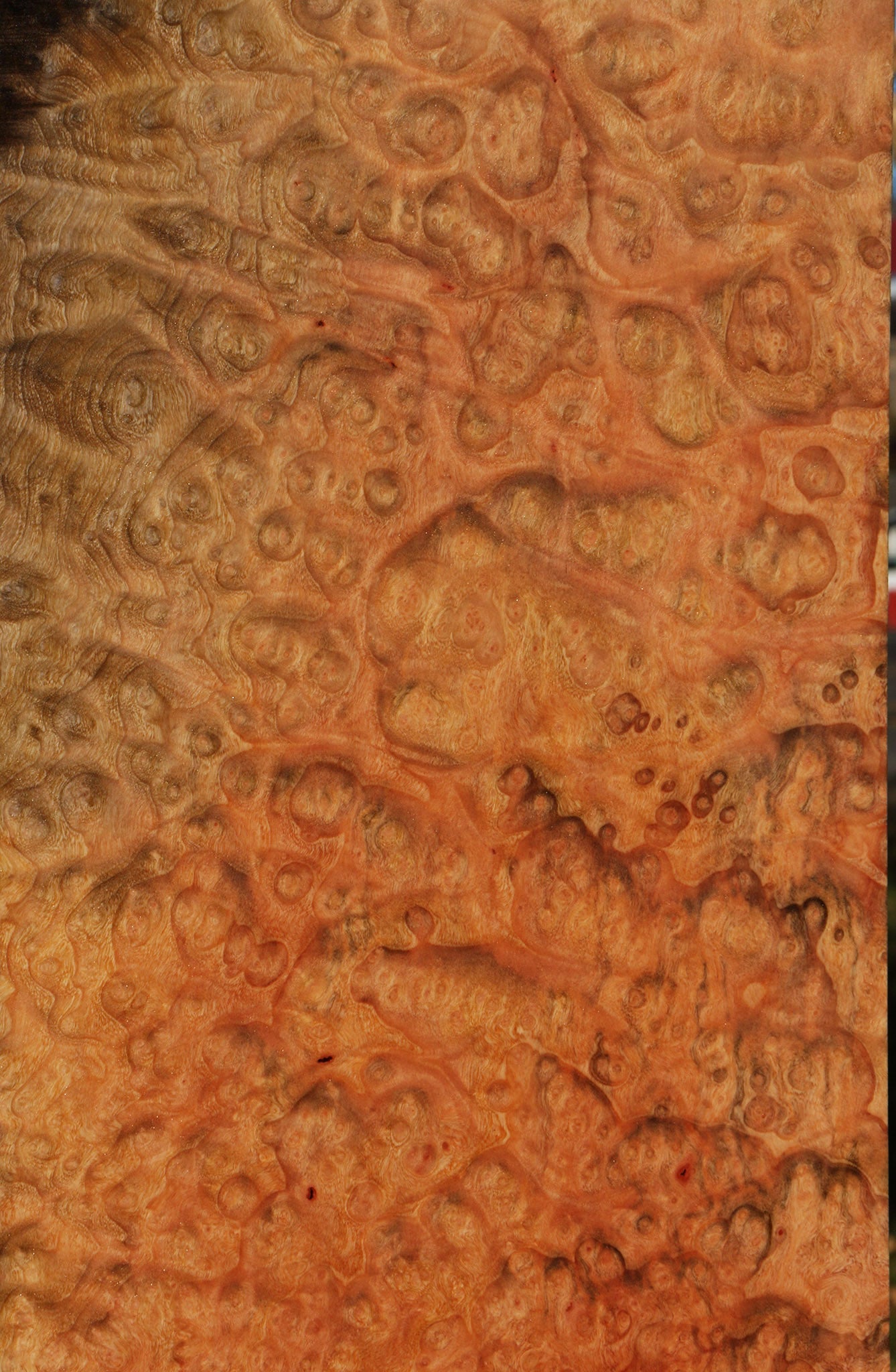 This Madrone burl lumber has pinkish brown color and lots of interesting grain! Dark red streaks might be present in some pieces. Madrone is a Pacific Northwest hardwood that is very easy to work with and finish. This burl was pressure cooked and vacuum kiln dried. The internal stress has been removed through the pressure cooking process. An occasional surface or edge check may be present. Checks or inclusions are normal in the burl eyes. If black color is present on the edges of the board, it usually does not penetrate further than 1/4". This is a gorgeous species that is ideal for many woodworking projects! This piece has a partial live edge. Please see pictures for details.