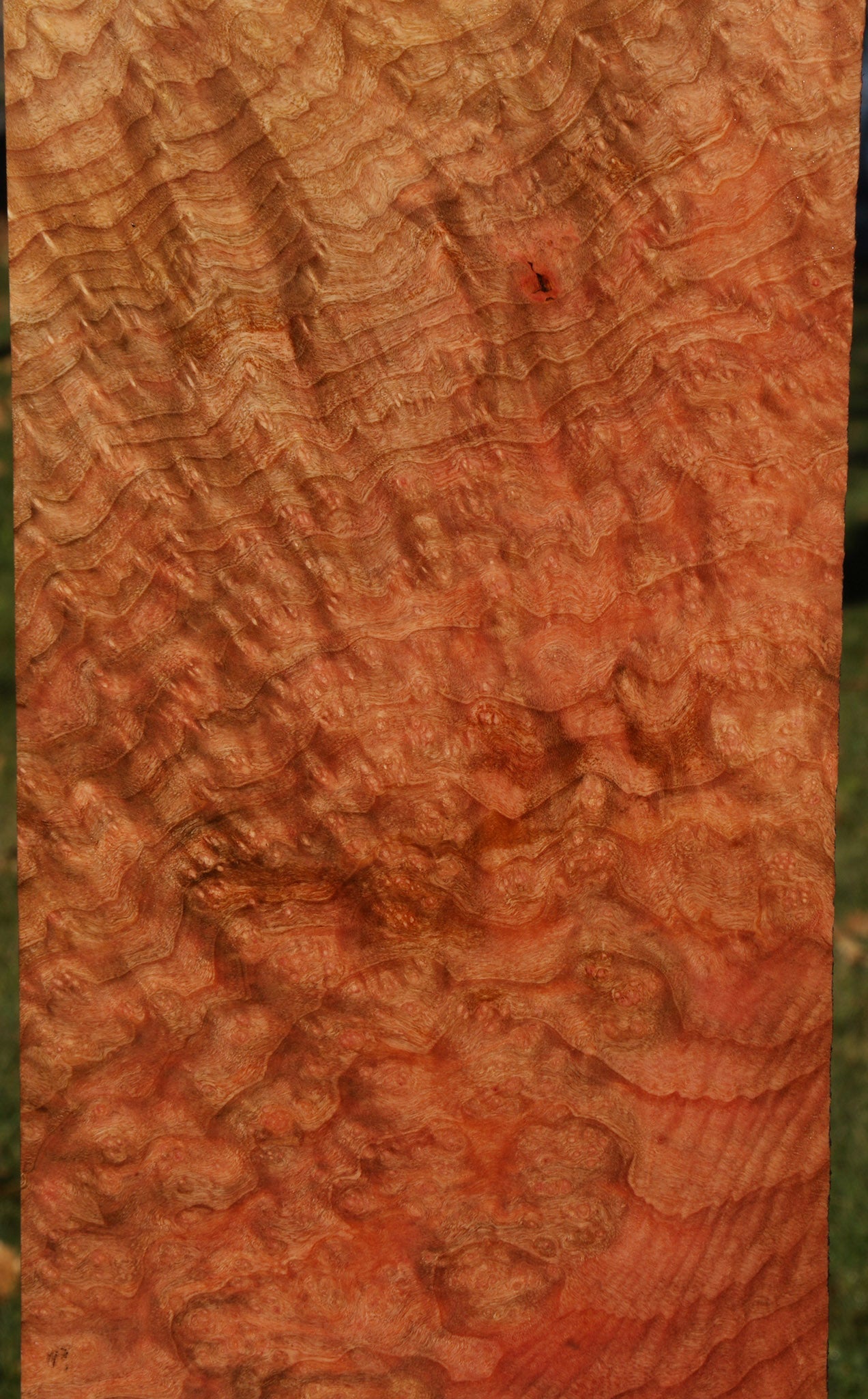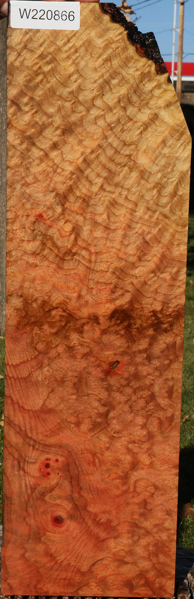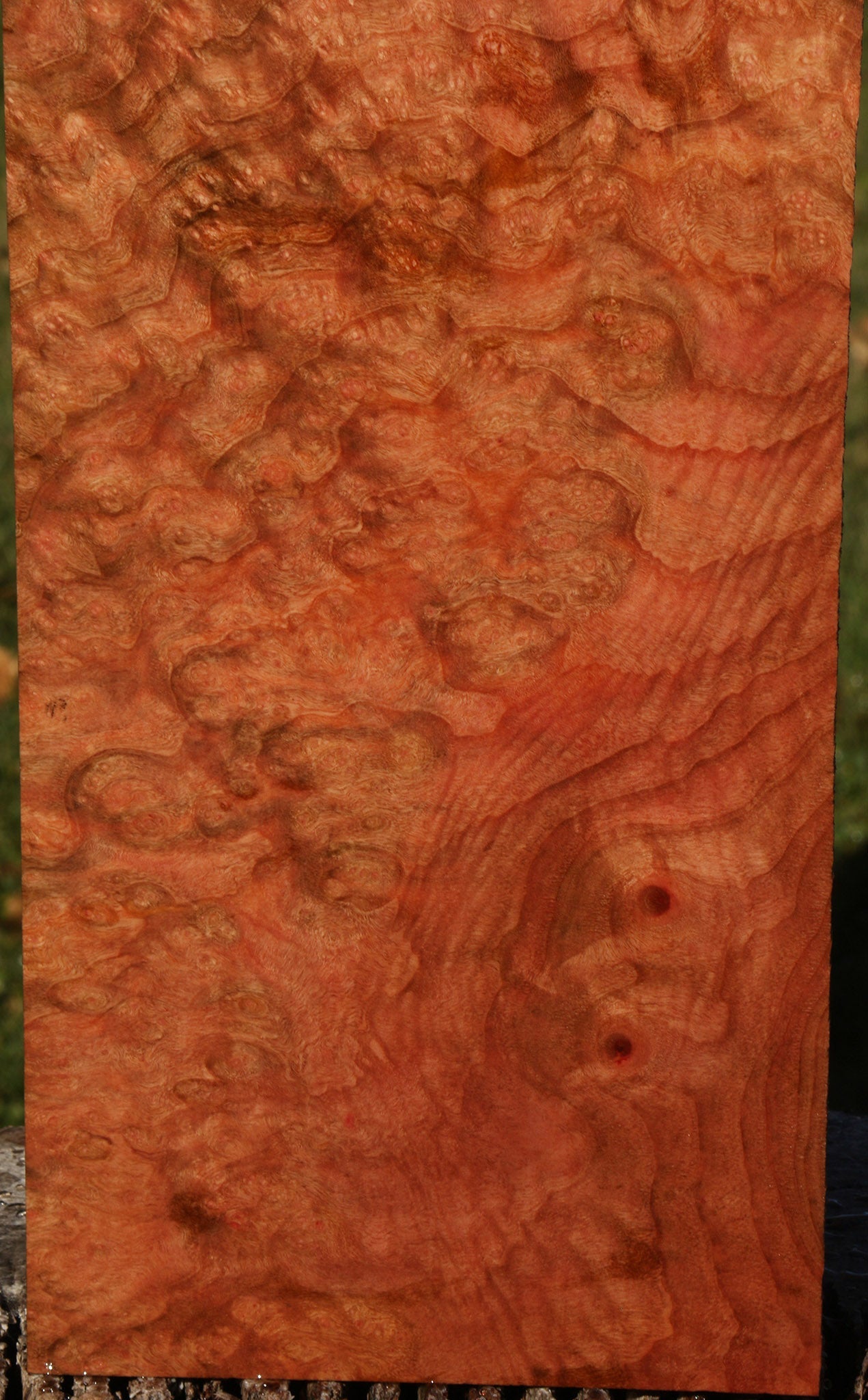 This Madrone burl lumber has pinkish brown color and lots of interesting grain! Dark red streaks might be present in some pieces. Madrone is a Pacific Northwest hardwood that is very easy to work with and finish. This burl was pressure cooked and vacuum kiln dried. The internal stress has been removed through the pressure cooking process. An occasional surface or edge check may be present. Checks or inclusions are normal in the burl eyes. If black color is present on the edges of the board, it usually does not penetrate further than 1/4". This is a gorgeous species that is ideal for many woodworking projects! This piece has rough corners and inclusions. Please see pictures for details.